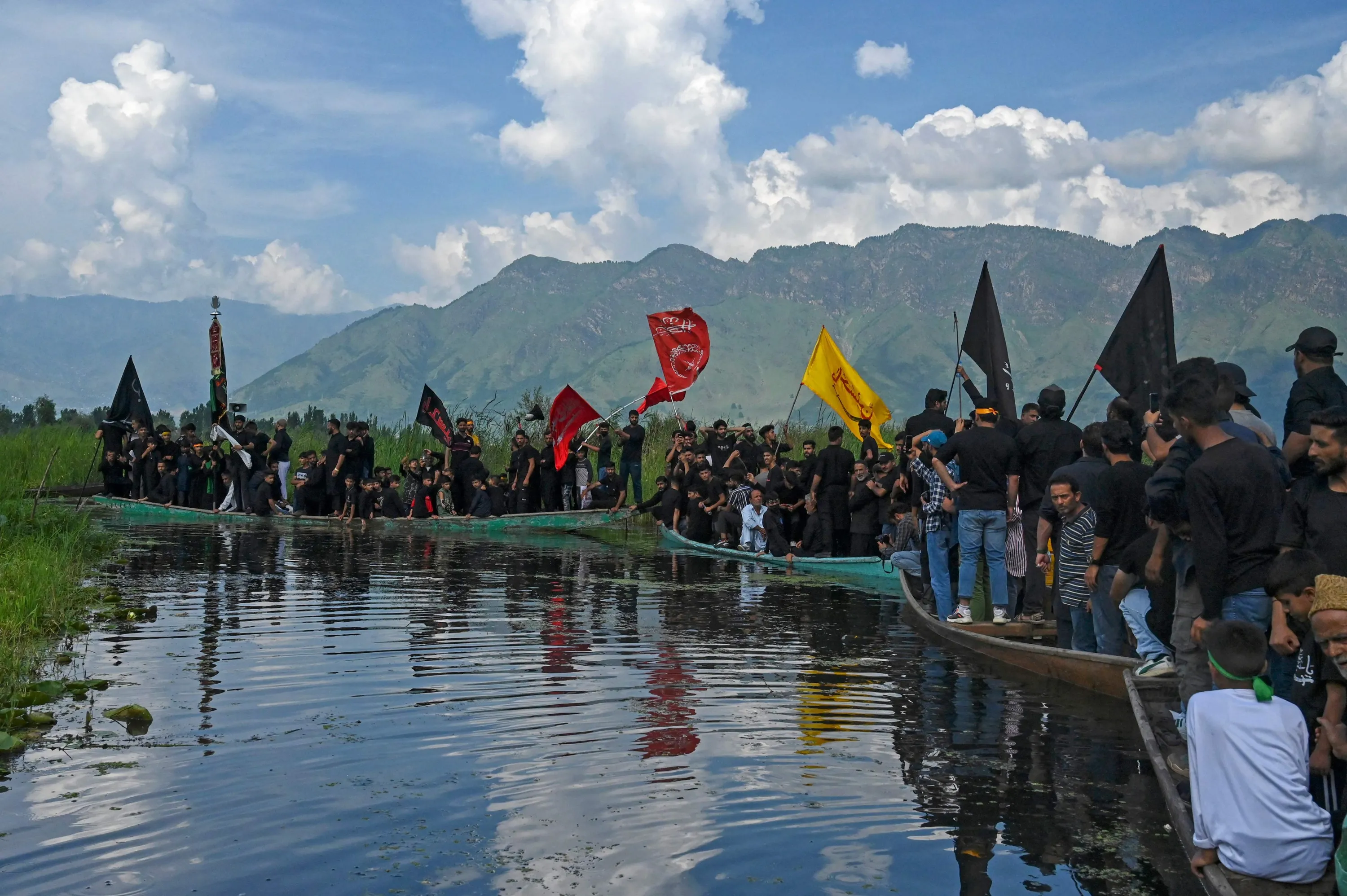 Shiite Muslim mourners participate in a Muharram procession on the ninth day of Ashura in the interiors of Dal Lake in Srinagar on August 8, 2022. Ashura is a period of mourning in remembrance of the seventh-century martyrdom of Prophet Mohammad's grandson Imam Hussein, who was killed in the battle of Karbala in modern-day Iraq, in 680 AD. (Photo by Tauseef Mustafa/AFP Photo)