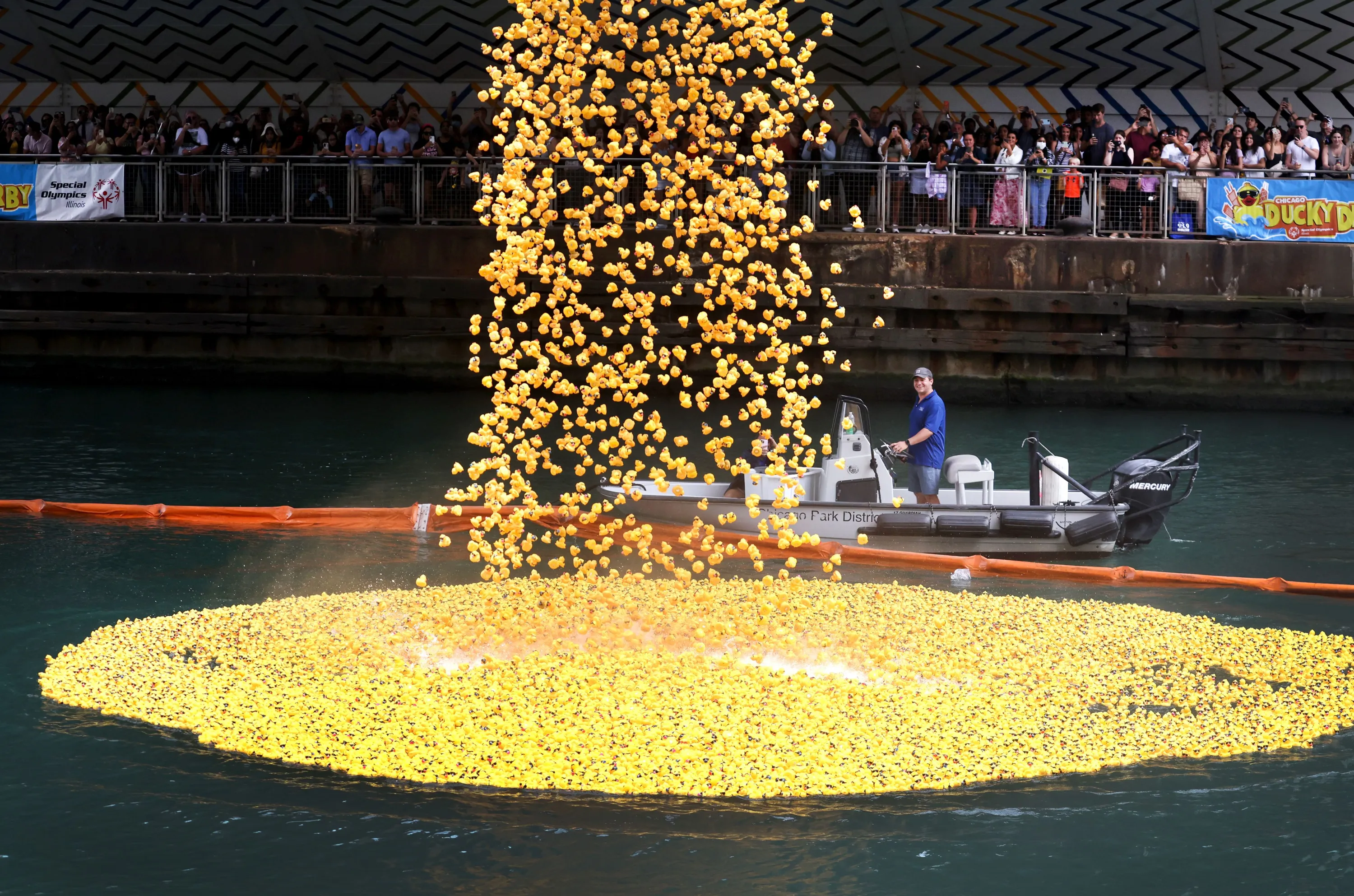 Seventy-five thousand rubber ducks are dumped into the Chicago River during the Chicago Ducky Derby on August 04, 2022 in Chicago, Illinois. The ducks are dumped into the river as part of a fundraising event for Special Olympics Illinois. The individual ducks, which are adopted by supporters for $5 each, race to a nearby location with prizes and cash being awarded to holders of the winning ducks. (Photo by Scott Olson/Getty Images)