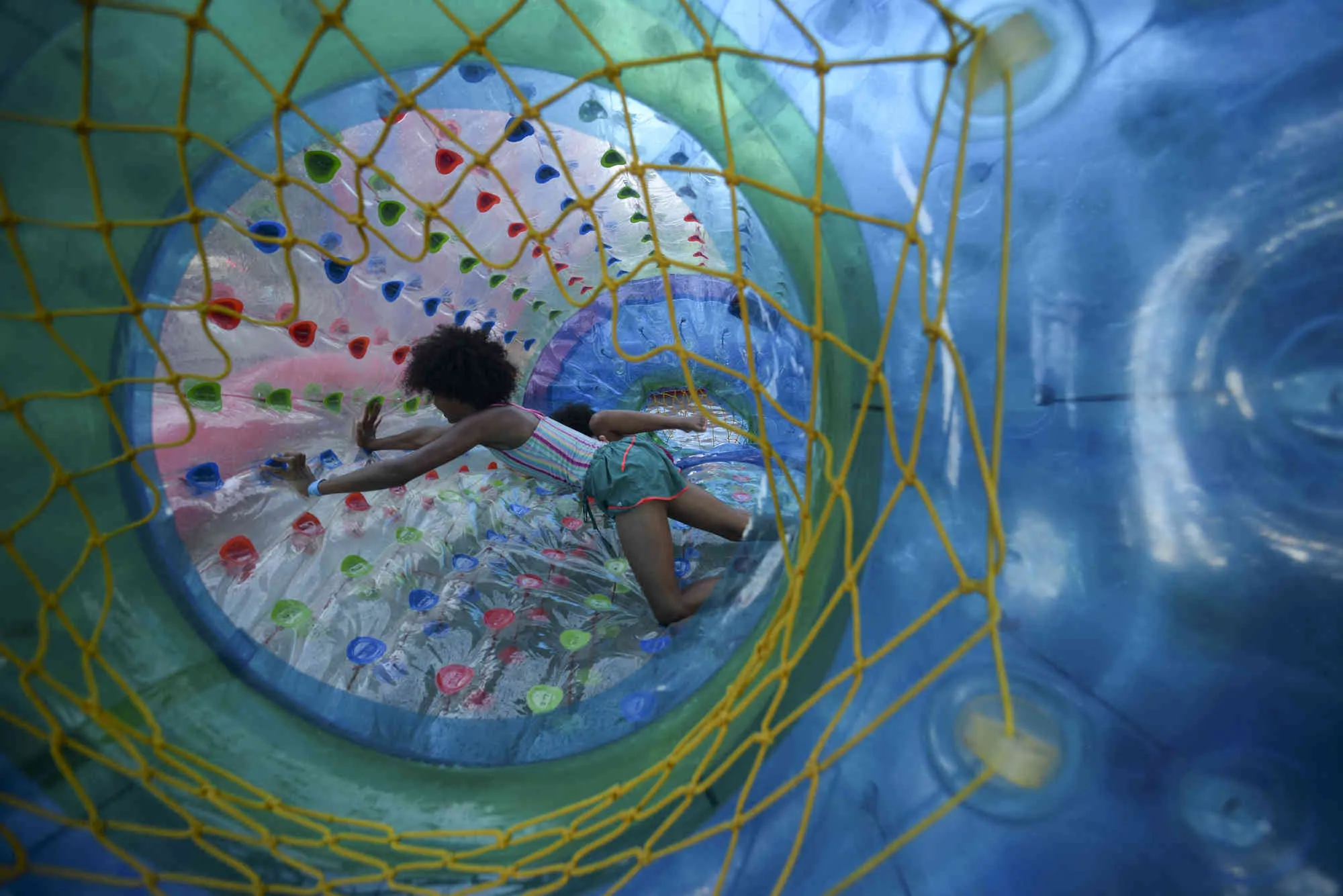 Jayla Kennett, 11, from Bellows Falls, rolls around in an inflatable floating ball at the Waypoint Center during the 45th annual Rockingham Old Home Days on Saturday, August 6, 2022 in Bellows Falls, Vt. (Photo by Kristopher Radder/The Brattleboro Reformer via AP Photo)