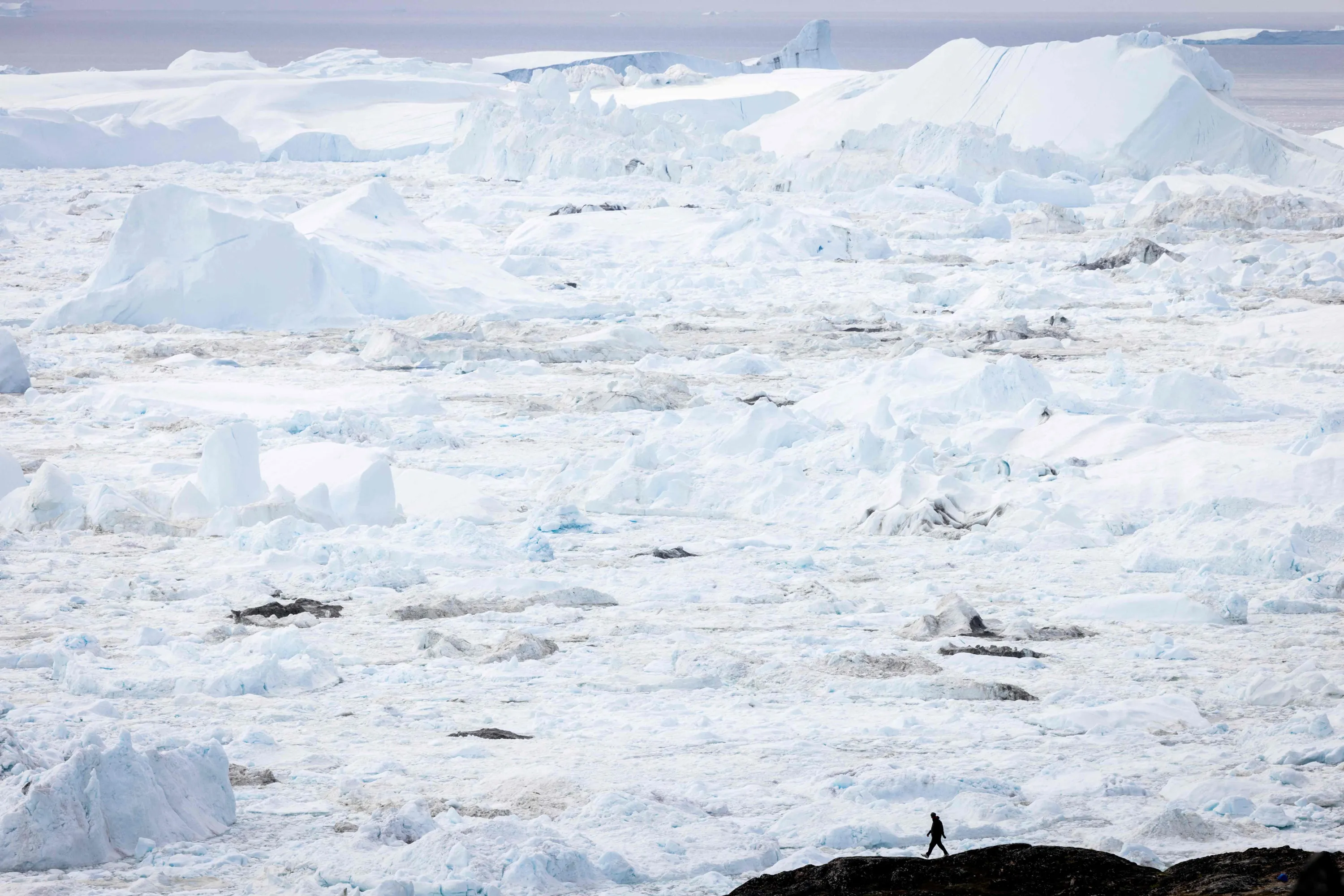 A man is silhouetted and dwarfed by icebergs floating in the water as he walks along a ridge in Disko bay, Ilulissat, western Greenland, on June 29, 2022. The icebergs originate from Jakobshavn glacier (Sermeq Kujalleq), the most productive glacier in the Northern Hemisphere. The massive icebergs that detach from the glacier float for years in the waters in front of the fjord before being carried south by ocean currents. (Photo by Odd Andersen/AFP Photo)