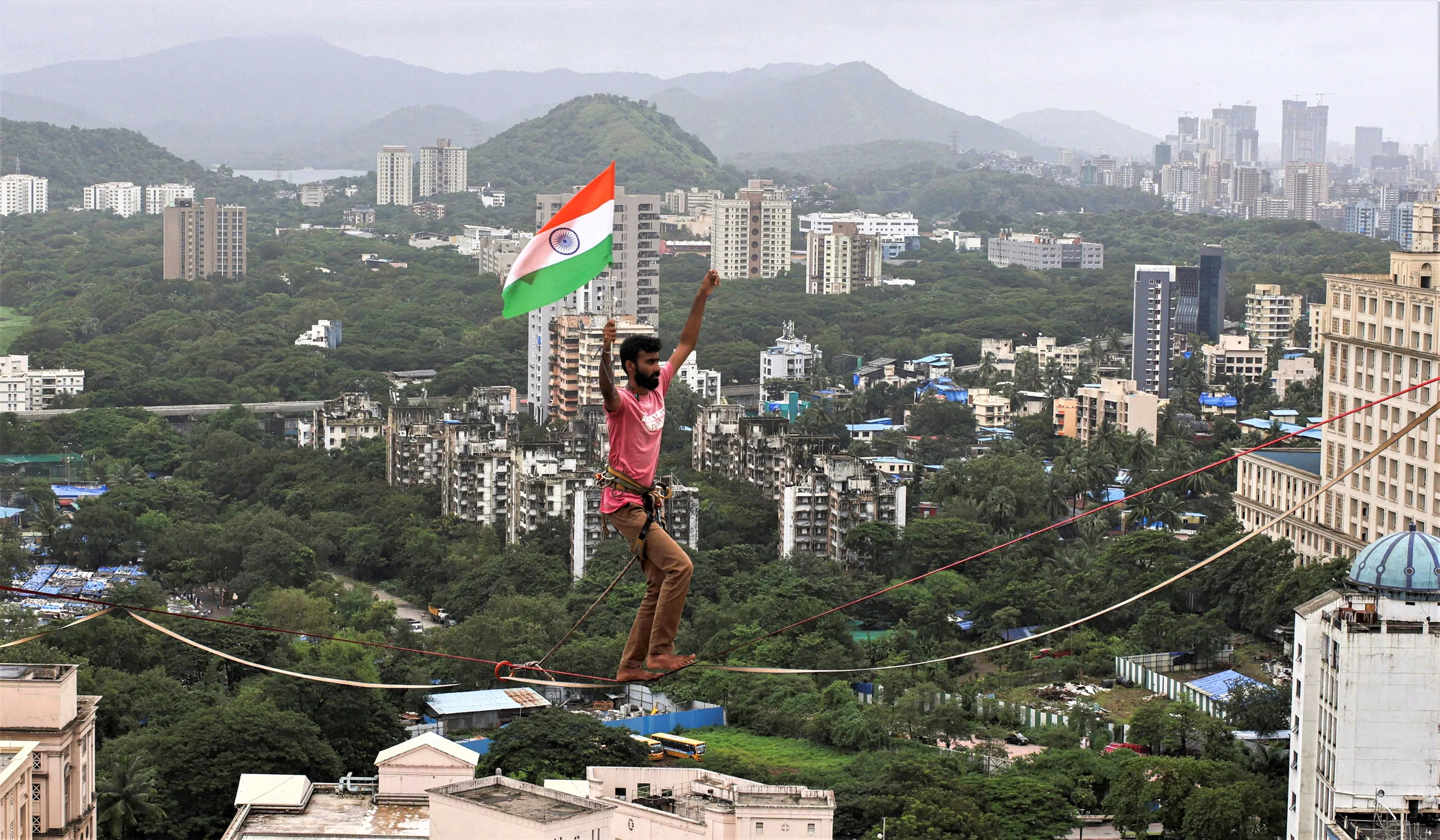 Harsdeep Powar from Team Slackistan walks a rope, holding the flag of India to celebrate the country's 75th Independence Day in Mumbai, India on August 15, 2022. (Photo by Francis Mascarenhas/Reuters)