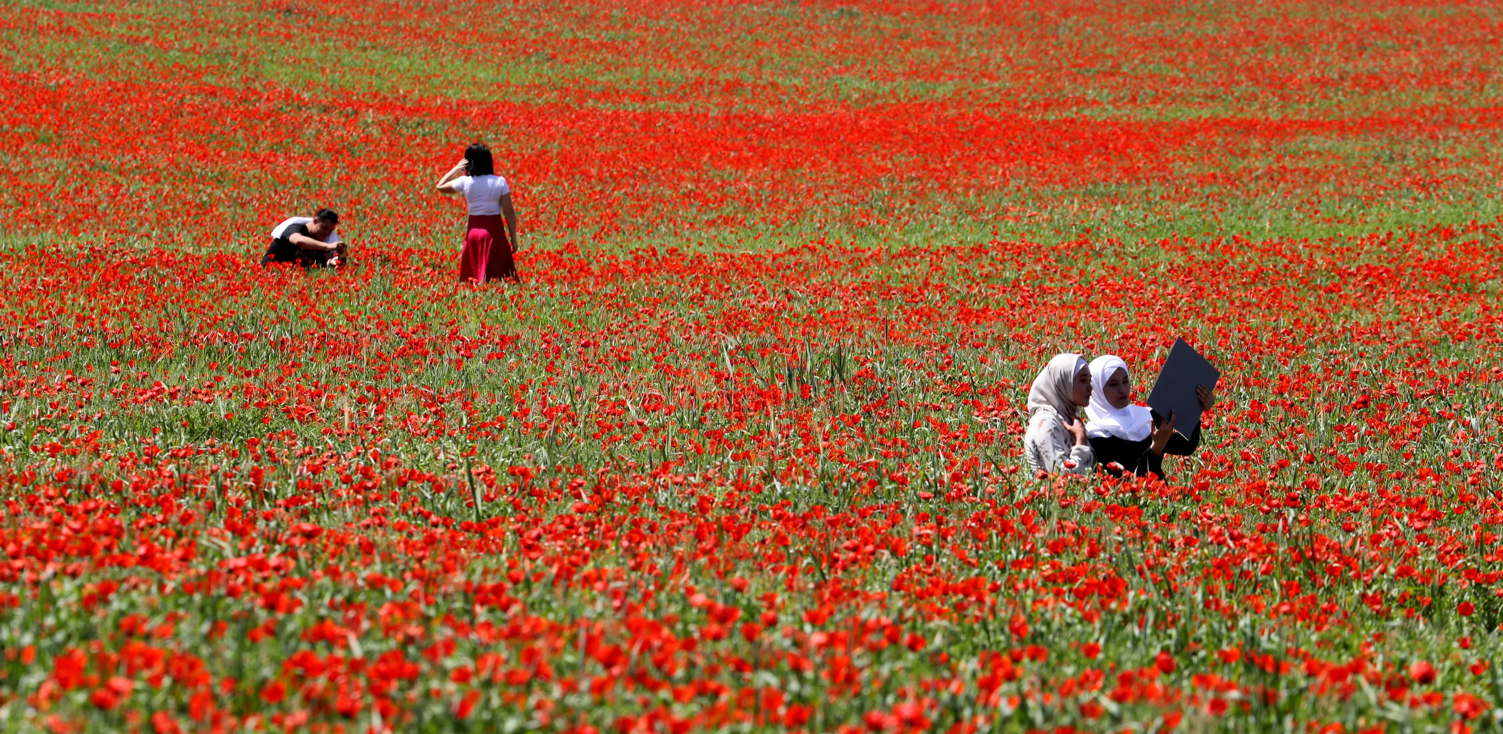 Poppy flowers bloom on a field in the village of Leninskoye, some 25 kilometers from Bishkek, Kyrgyzstan, 28 April 2022. After heavy rains and the temperature in Bishkek rising to up to 28 degrees Celsius on 28 April, the poppies are in full bloom on many of the in Kyrgyz region's fields. (Photo by Igor Kovalenko/EPA/EFE)