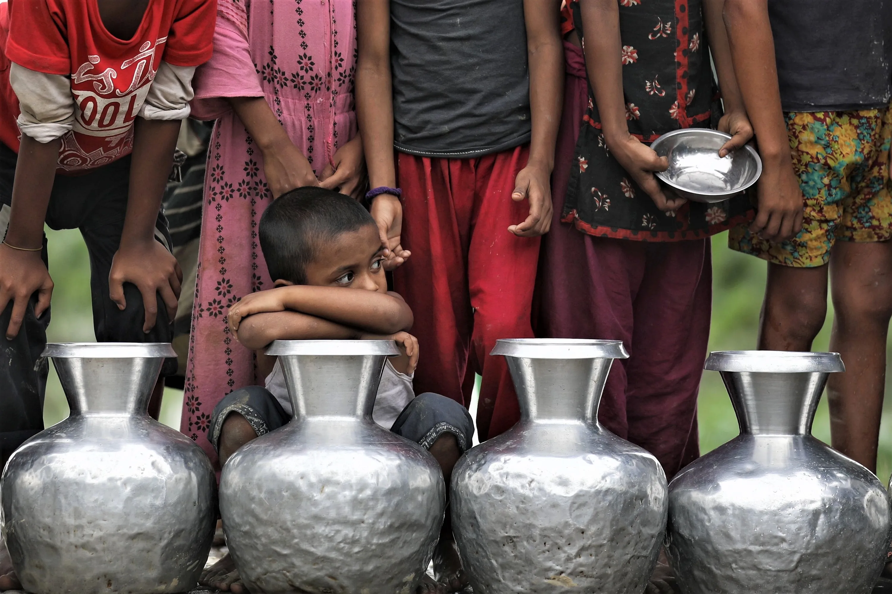 Children wait in a line as they came a long way to collect safe drinking water in a flooded area in Companiganj, Sylhet, Bangladesh on June 21, 2022. (Photo by Syed Mahamudur Rahman/NurPhoto via Getty Images)