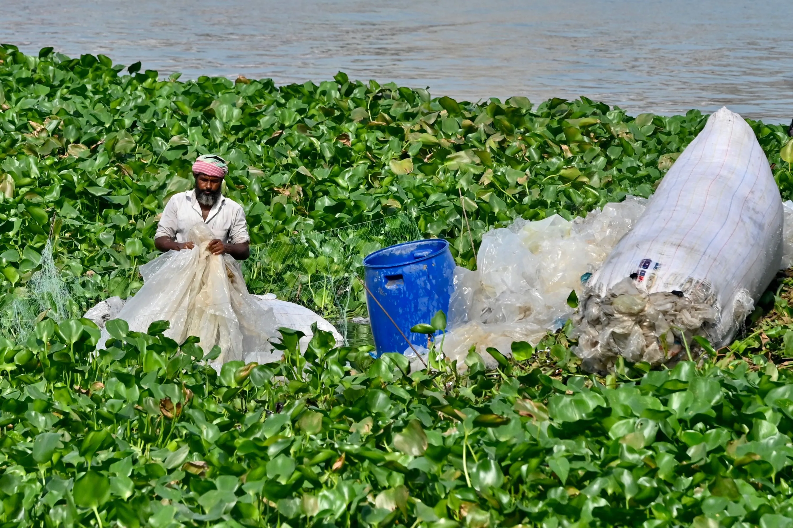 A worker wash used plastic bags in the Buriganga River in Dhaka on July 21, 2022. (Photo by Munir Uz Zaman/AFP Photo)