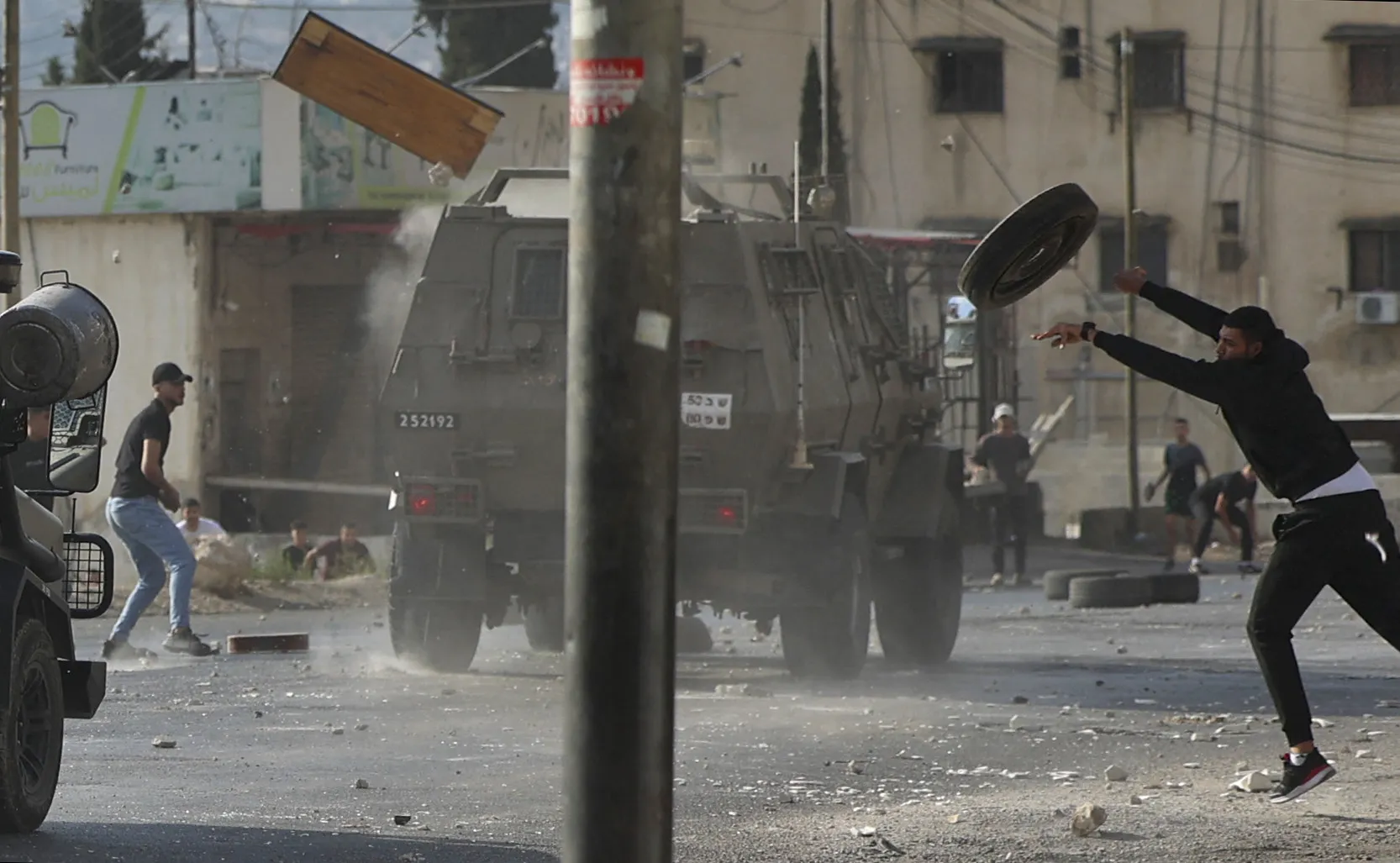 Palestinian youths throw objects at army vehicles during a military operation by the Israeli army to arrest wanted persons from the Balata camp near the West Bank city of Nablus, on August 17, 2022. (Photo by Jaafar Ashtiyeh/AFP Photo)