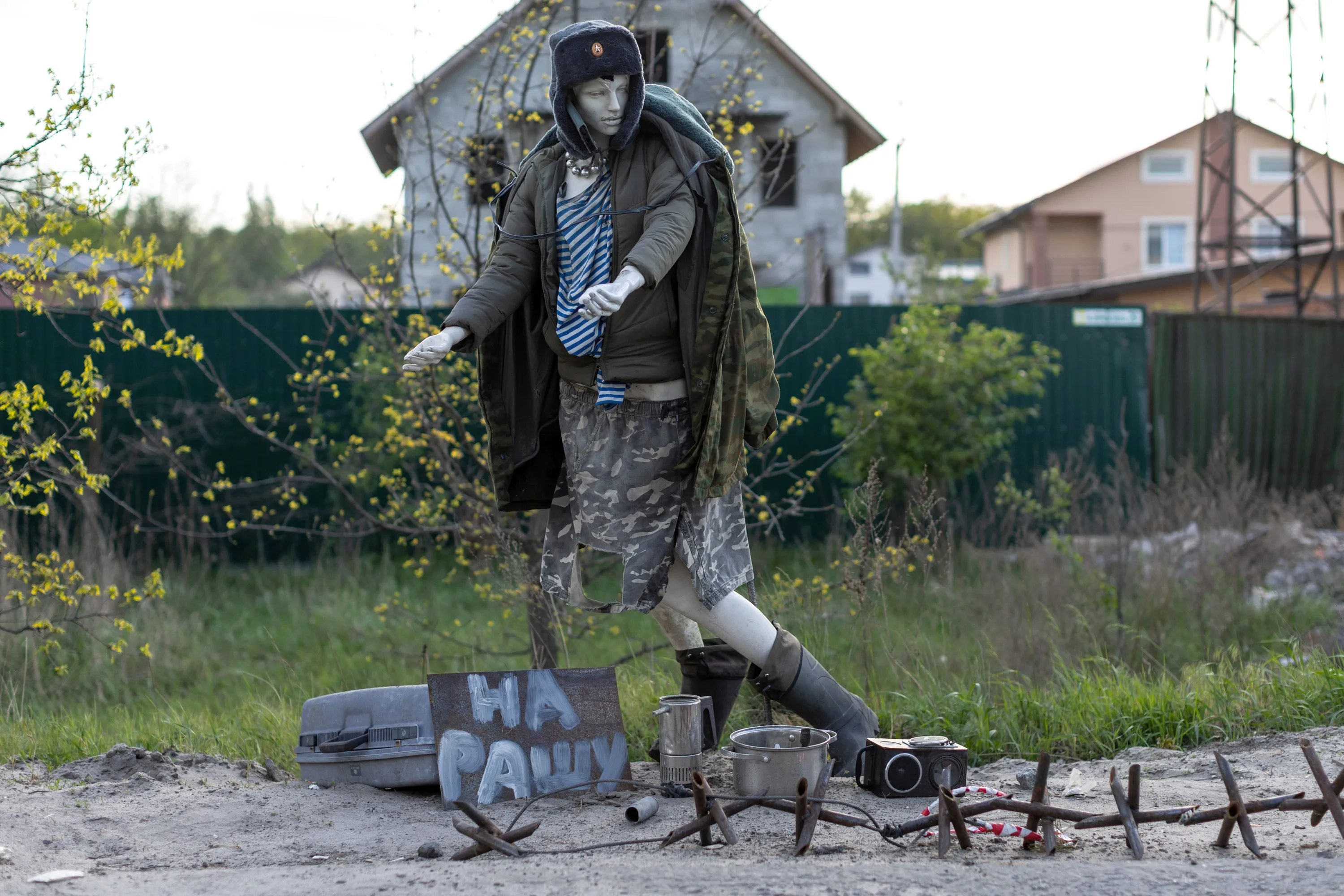 A mannequin depecting a Russian soldier is seen with a sign reading “to Russia” in an abandoned check point, amid Russia's invasion of Ukraine, in Borodyanka outside Kyiv, Ukraine on May 16, 2022. (Photo by Jorge Silva/Reuters)