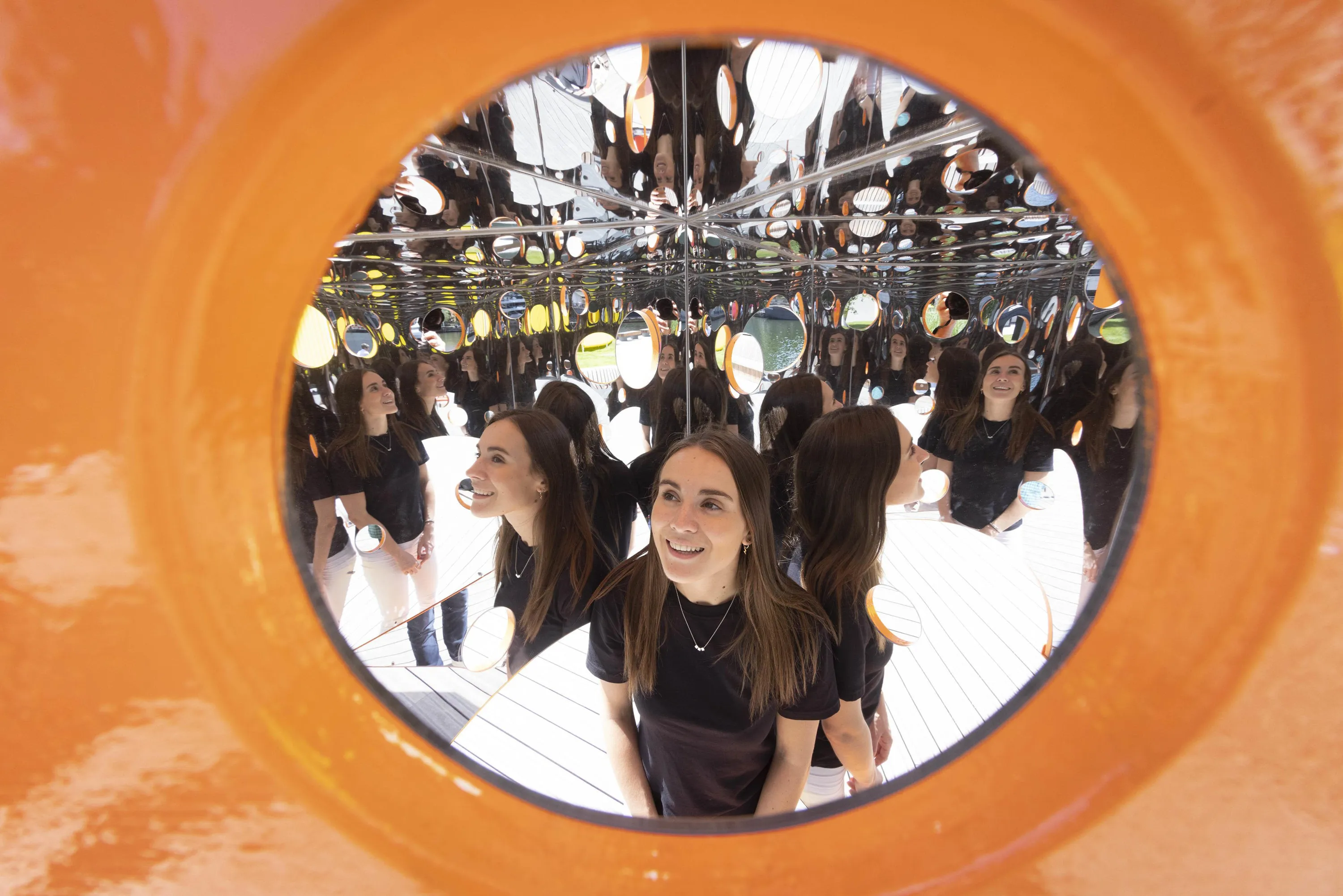 Megan Painter takes in an installation titled Infinity and Beyond, by the artists Martin Richman and Emma Kate Matthews, at Harbour Quay Gardens, as it is unveiled as part of the Summer Lights show at Canary Wharf, London on June 20, 2022. (Photo by Matt Alexander/PA Wire Press Association)