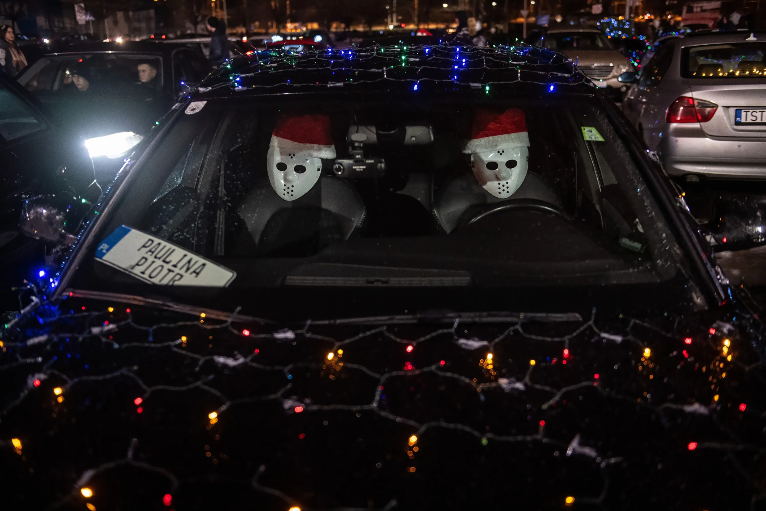 Polish automotive enthusiasts meet at the annual motorized midnight mass in the parking lot of a shopping center in Lublin, Poland, on the night between 24 and 25 December 2021. (Photo by Wojtek Jargilo/EPA/EFE)