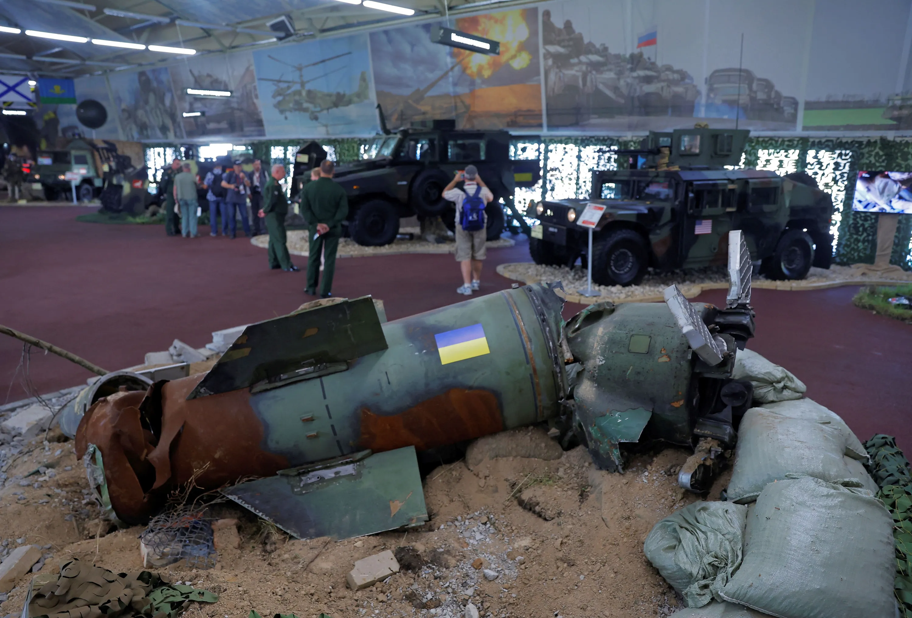Remains of the Tochka-U missile are on display during the exhibition of weaponry and equipment that, according to the Russian defence ministry, were captured during the military conflict in Ukraine, at the international military-technical forum Army-2022 at Patriot Congress and Exhibition Centre in the Moscow region, Russia on August 17, 2022. (Photo by Reuters/Stringer)
