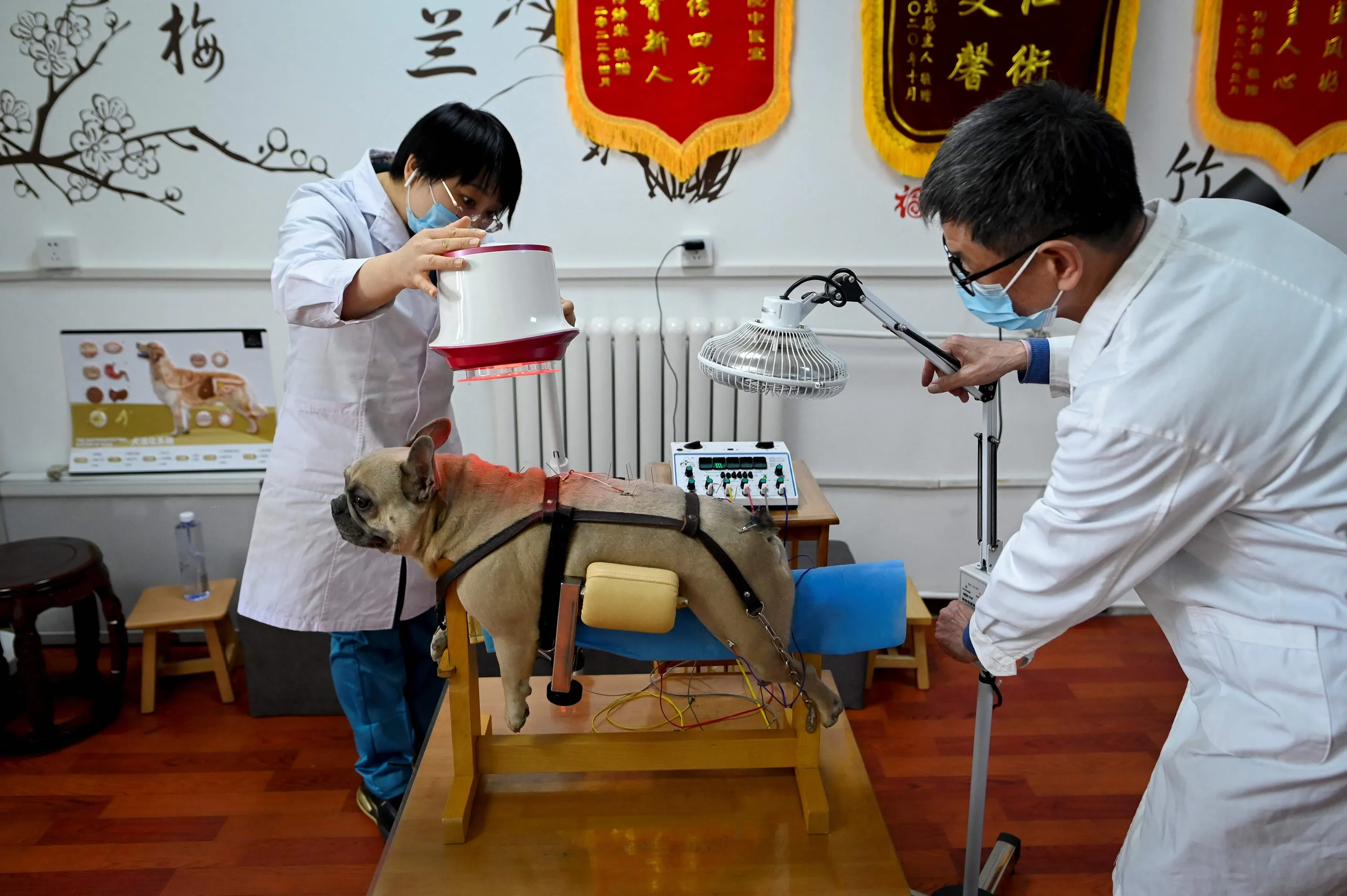 This picture taken on April 12, 2022 shows a dog receiving acupuncture and physiotherapy at an animal clinic in Beijing. A growing number of animals are being signed up for traditional medicine in China – care their masters say is less invasive and comes with fewer side effects than conventional treatments. (Photo by Wang Zhao/AFP Photo)