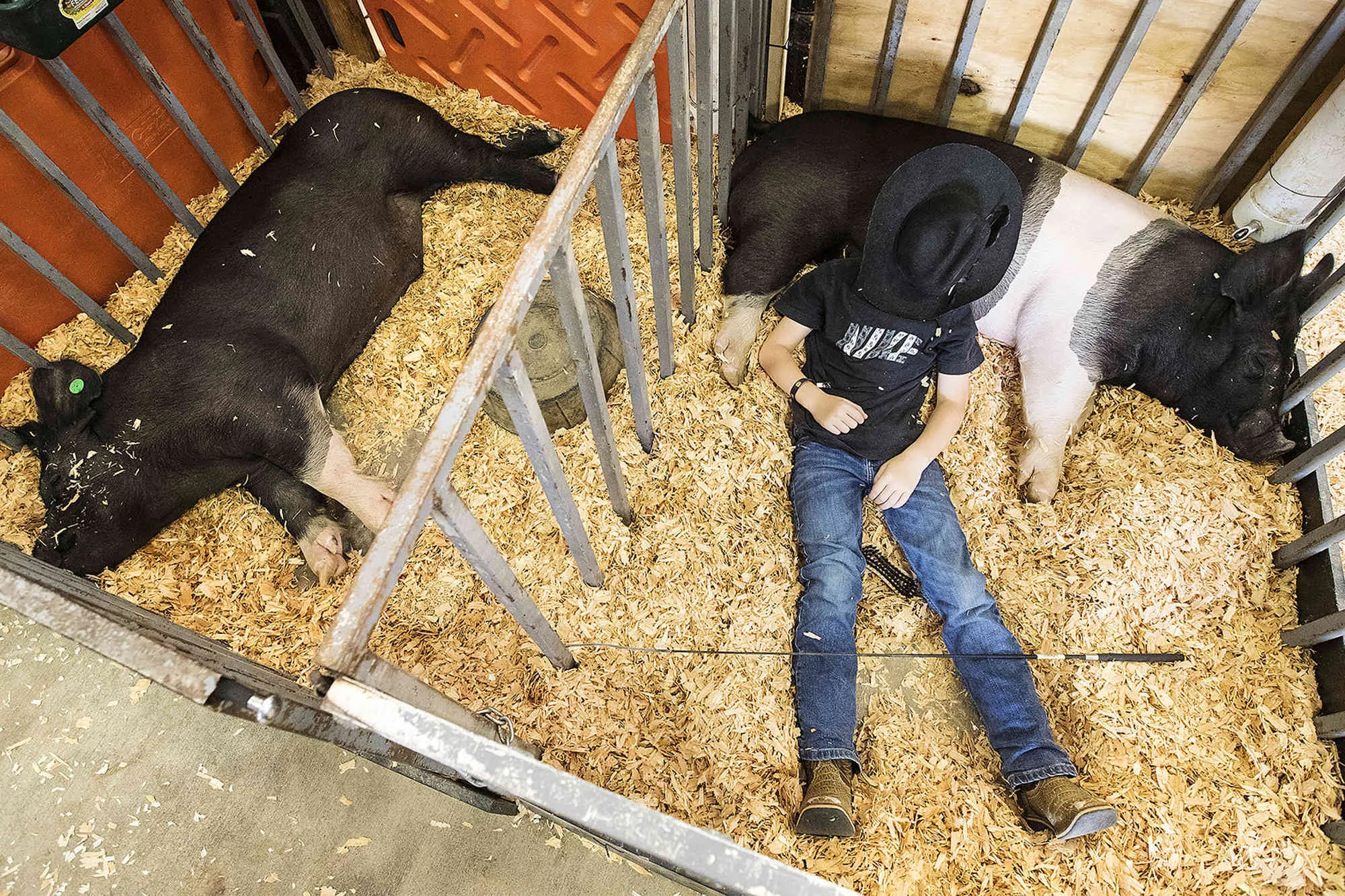 Brock Fisher, 6, takes a nap under a cooling fan with “Charlie” on Wednesday, August 3, 2022, while taking a break from helping 4-H members wrangle livestock during the Deschutes County Fair and Rodeo in Redmond, Ore. (Photo by Ryan Brennecke/The Bulletin via AP Photo)