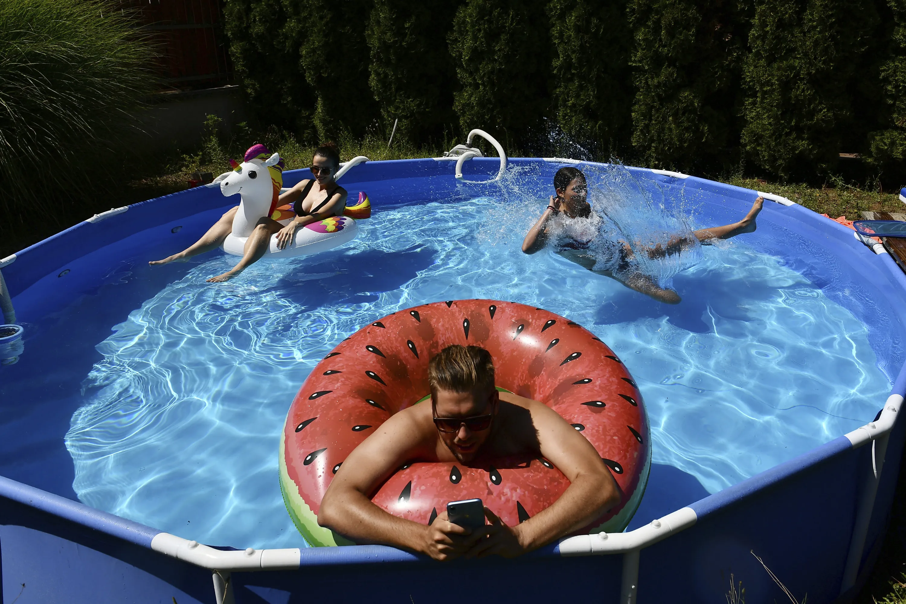 Barnabas types on his phone as he works from the home office as a pool in the garden while his wife, Rebeka, left and sister-in-law, Emma, cool down in Budapest, Hungary, Thursday, August 4, 2022. Hungary has experienced several heat waves since mid June with day-time temperatures rising to 40 degrees Celsius and remaining at tropical levels through the night. In fact, the country recently shattered record for its hottest night ever when temperature of 25.4 C was measured in Budapest on July 26. (Photo by Anna Szilagyi/AP Photo)
