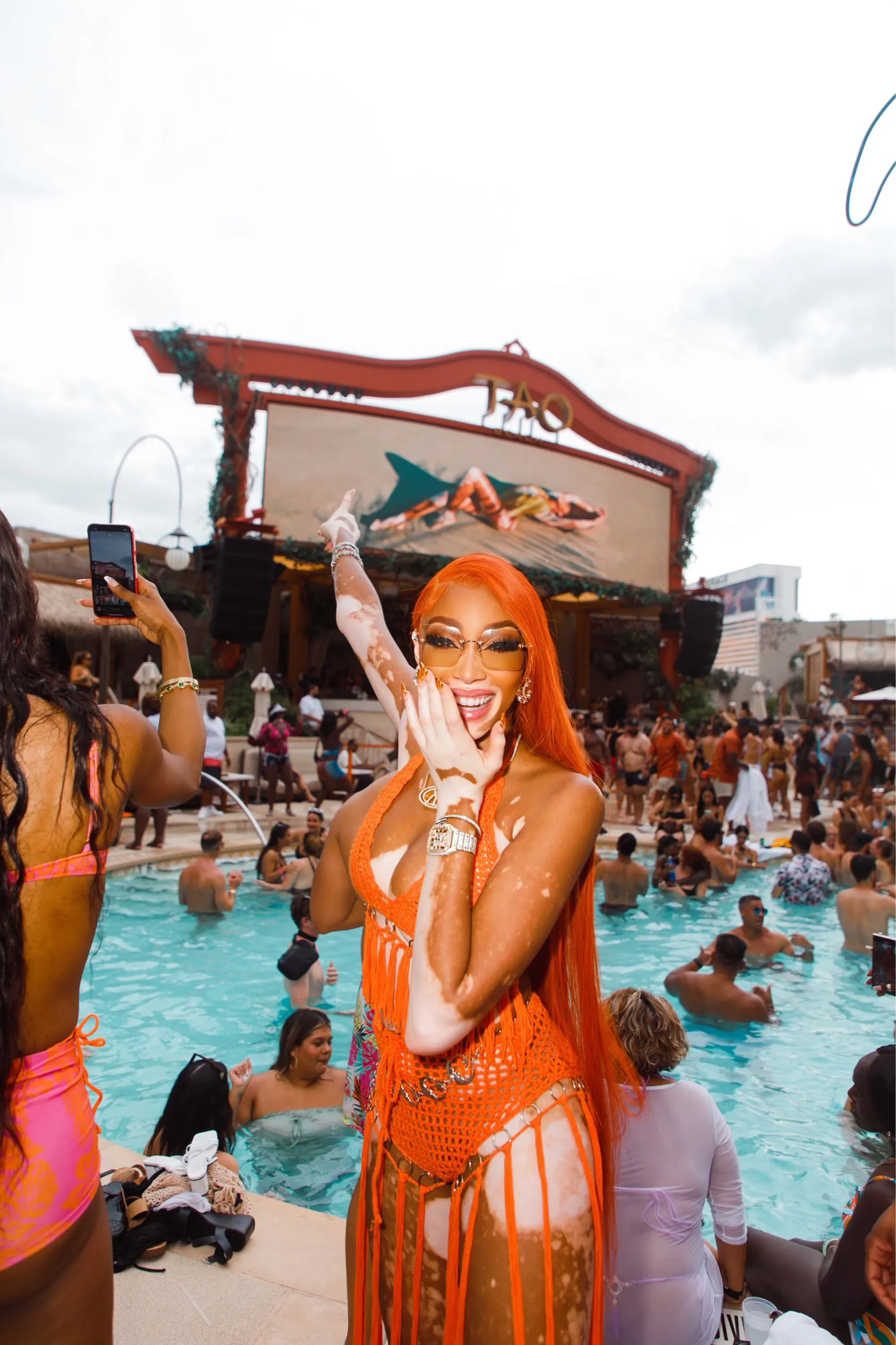 Canadian fashion model Winnie Harlow spent the weekend at The Venetian Resort Las Vegas and was seen celebrating Cay Skin at TAO Beach Dayclub in the second decade of August 2022. (Photo by )Jamie Bruce)