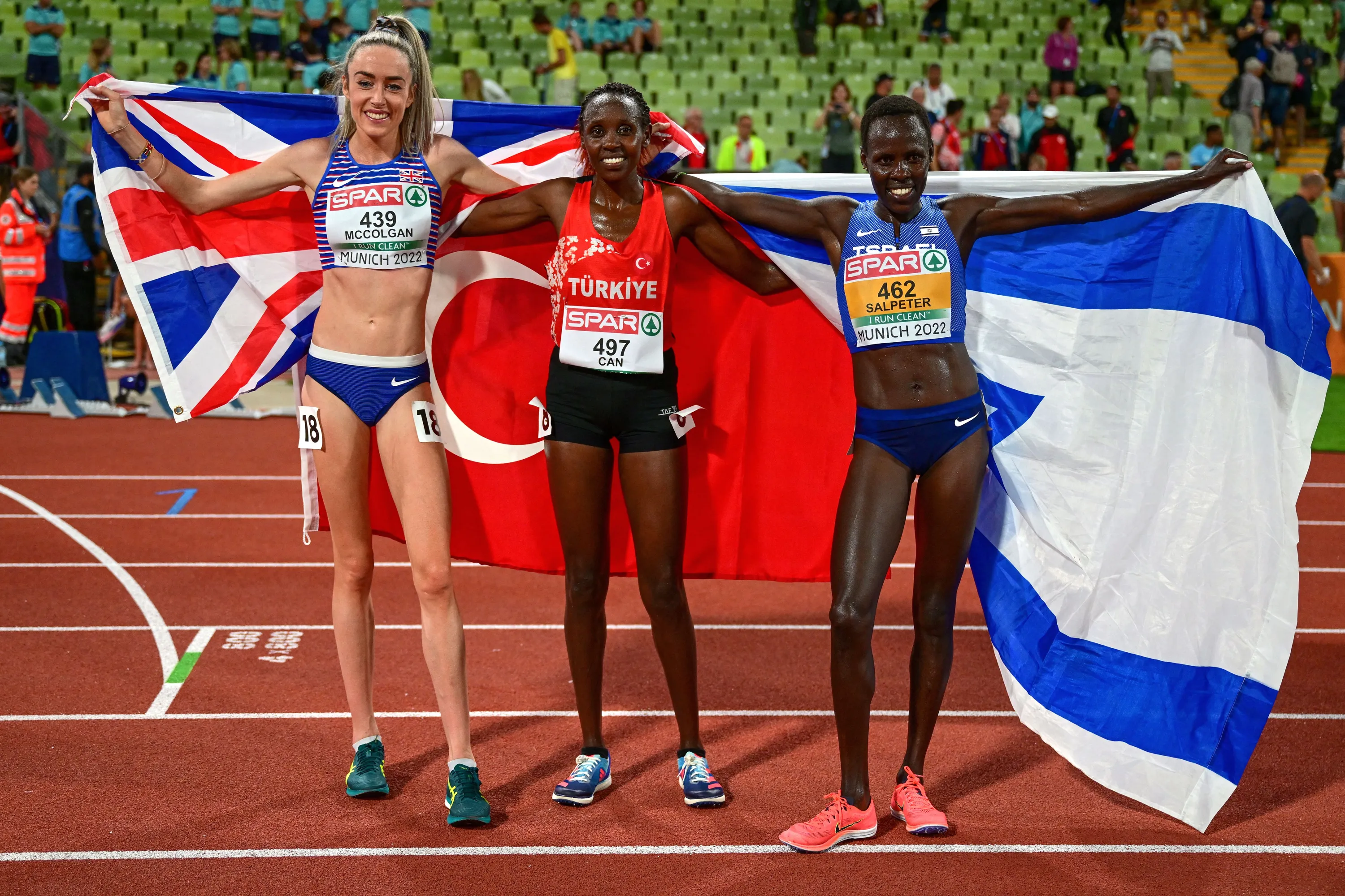 Turkey's Yasemin Can (C) celebrates winning gold ahead of Britain's Eilish McColgan (L) and Israel's Lonah Chemtai Salpeter in the women's 10,000m final during the European Athletics Championships at the Olympic Stadium in Munich, southern Germany on August 15, 2022. Turkey's Yasemin Can won gold ahead of Britain's Eilish McColgan and Israel's Lonah Chemtai Salpeter. (Photo by Andrej Isakovic/AFP Photo)