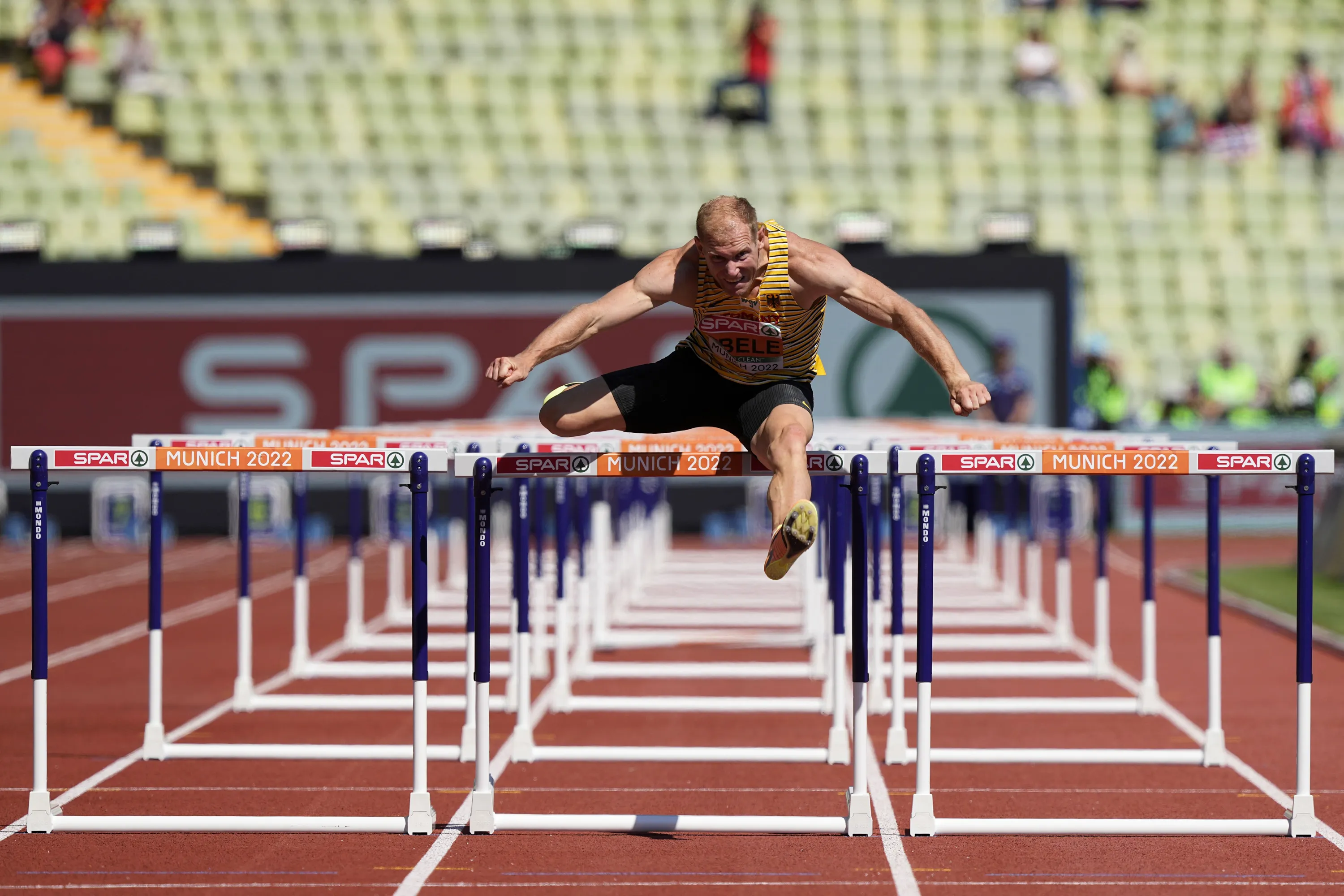 Arthur Abele, of Germany, runs alone in a Men's decathlon 110 meters hurdles heat during the athletics competition in the Olympic Stadium at the European Championships in Munich, Germany, Tuesday, August 16, 2022. Abele was disqualified from his original heat and then allowed to run a heat on his own after the decision was revised. (Photo by Martin Meissner/AP Photo)
