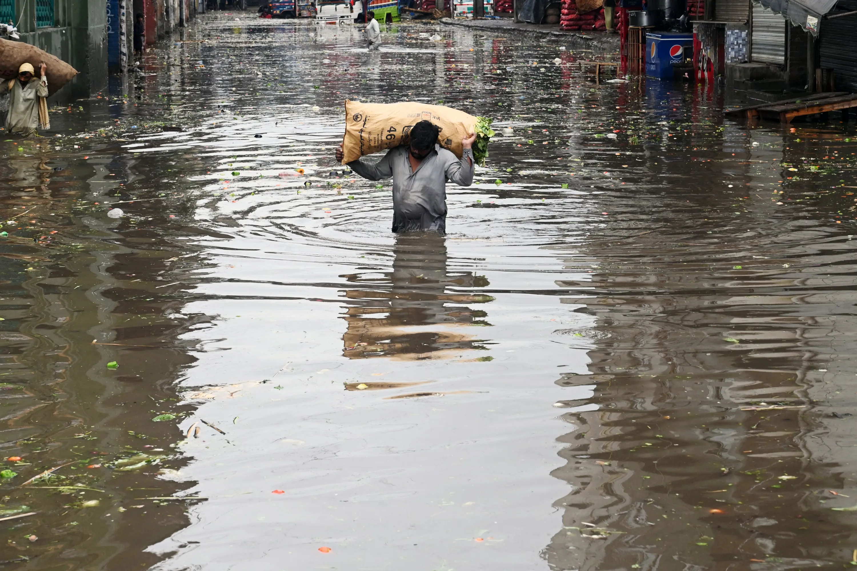 A vendor carries a sack of leafy vegetables wading across a flooded market place after heavy rainfall in Lahore on July 21, 2022. (Photo by Arif Ali/AFP Photo)