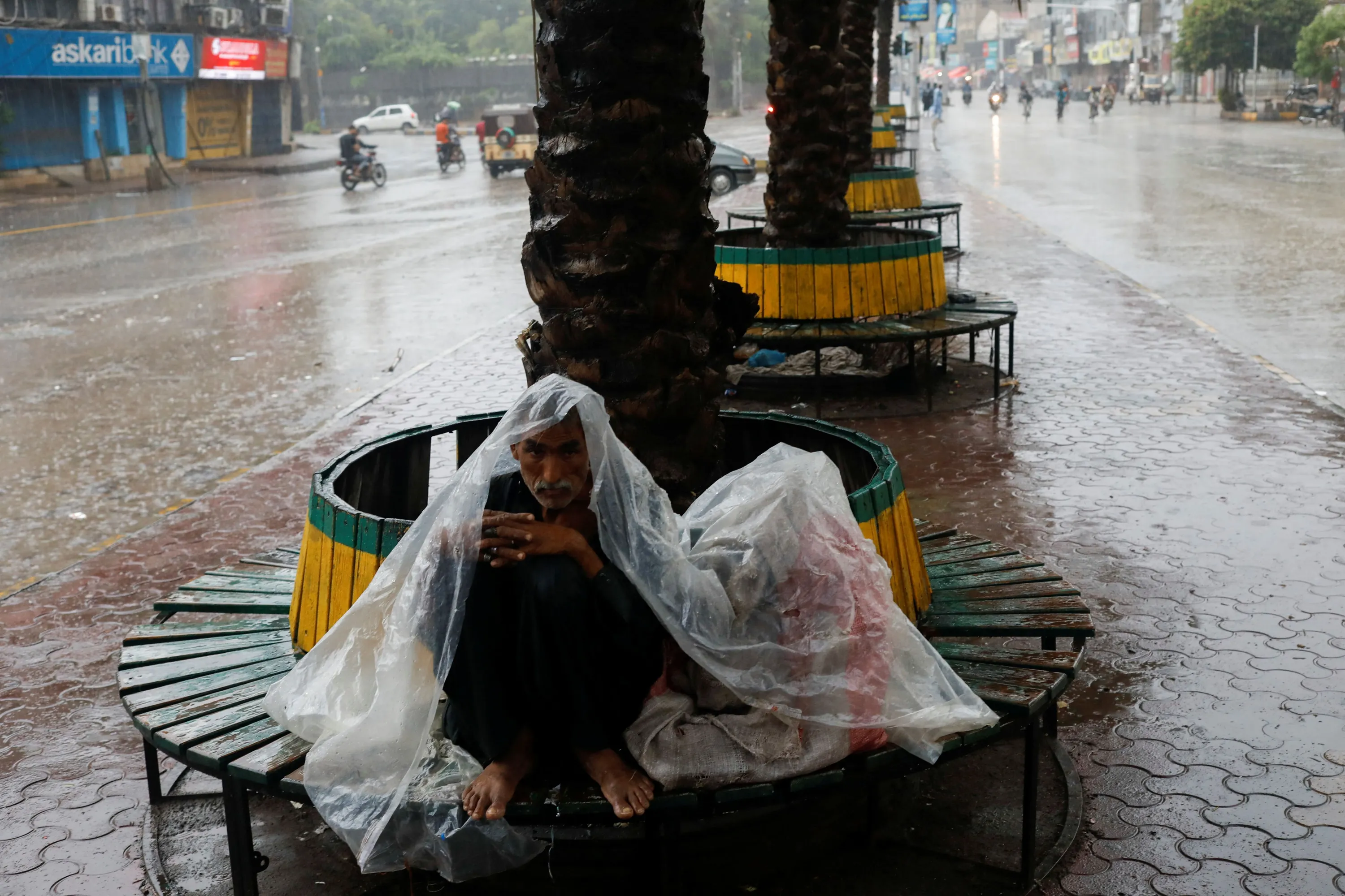 A man, covered with a plastic sheet to avoid rain, sits on a bench during the monsoon season, in Karachi, Pakistan on July 24, 2022. (Photo by Akhtar Soomro/Reuters)