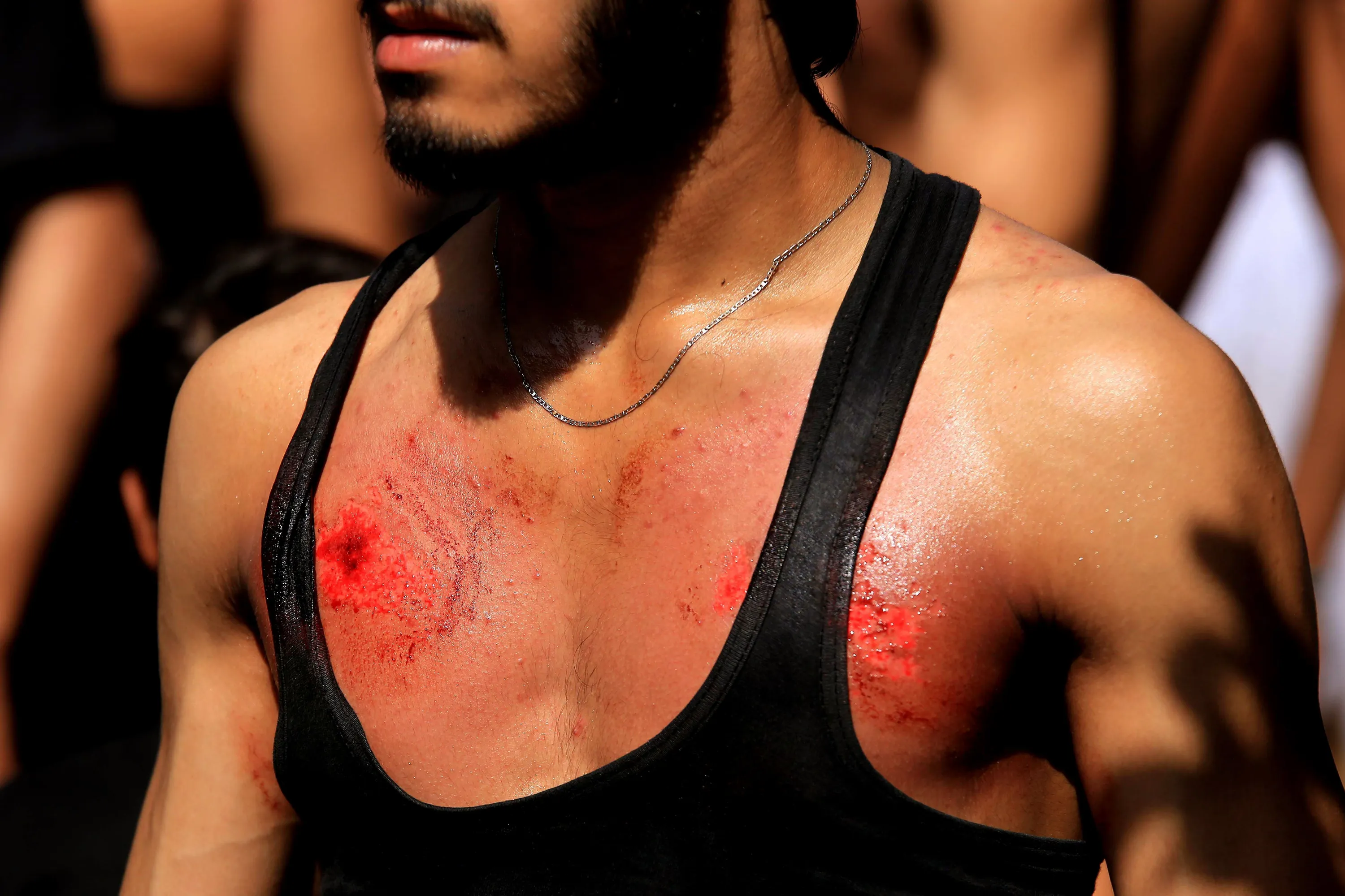 akistani Shiite Muslims beat themselves during a procession to mark the sacred month of Muharram, the first month of the Islamic Calendar, in Peshawar, Pakistan, 01 August 2022. Shiite Muslims are observing the holy month of Muharam, the climax of Muharram is reached on its tenth day with the marking of the Ashura festival, commemorating the martyrdom of Imam Hussain, a grandson of the Prophet Mohammed, in the battle of Karbala, Iraq, in the seventh century. (Photo by Bilawal Arbab/EPA/EFE)