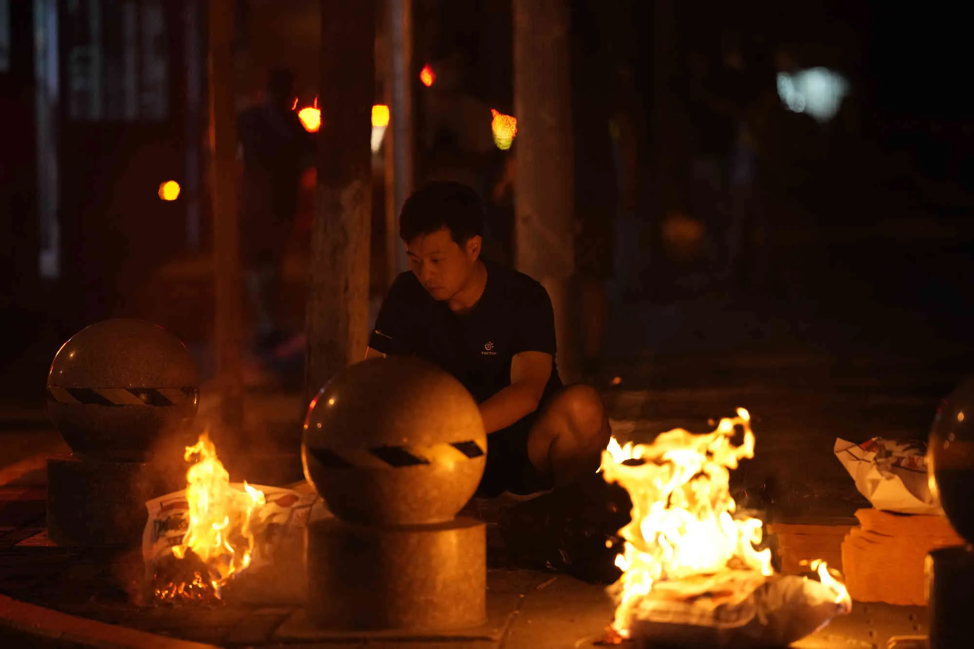 A resident burns paper offerings for deceased relatives during the traditional Zhongyuan Festival also known as the Ghost Festival, in Beijing, Friday, August 12, 2022. The traditional festival is celebrated during the seventh month of the Chinese lunar calendar, when prayers are offered to the dead and offerings of food and paper-made models of items such as televisions and cars are burned to appease wandering spirits as it is believed that the gates of hell are opened during the month and the souls of dead ancestors return to visit their relatives. (Photo by Ng Han Guan/AP Photo)