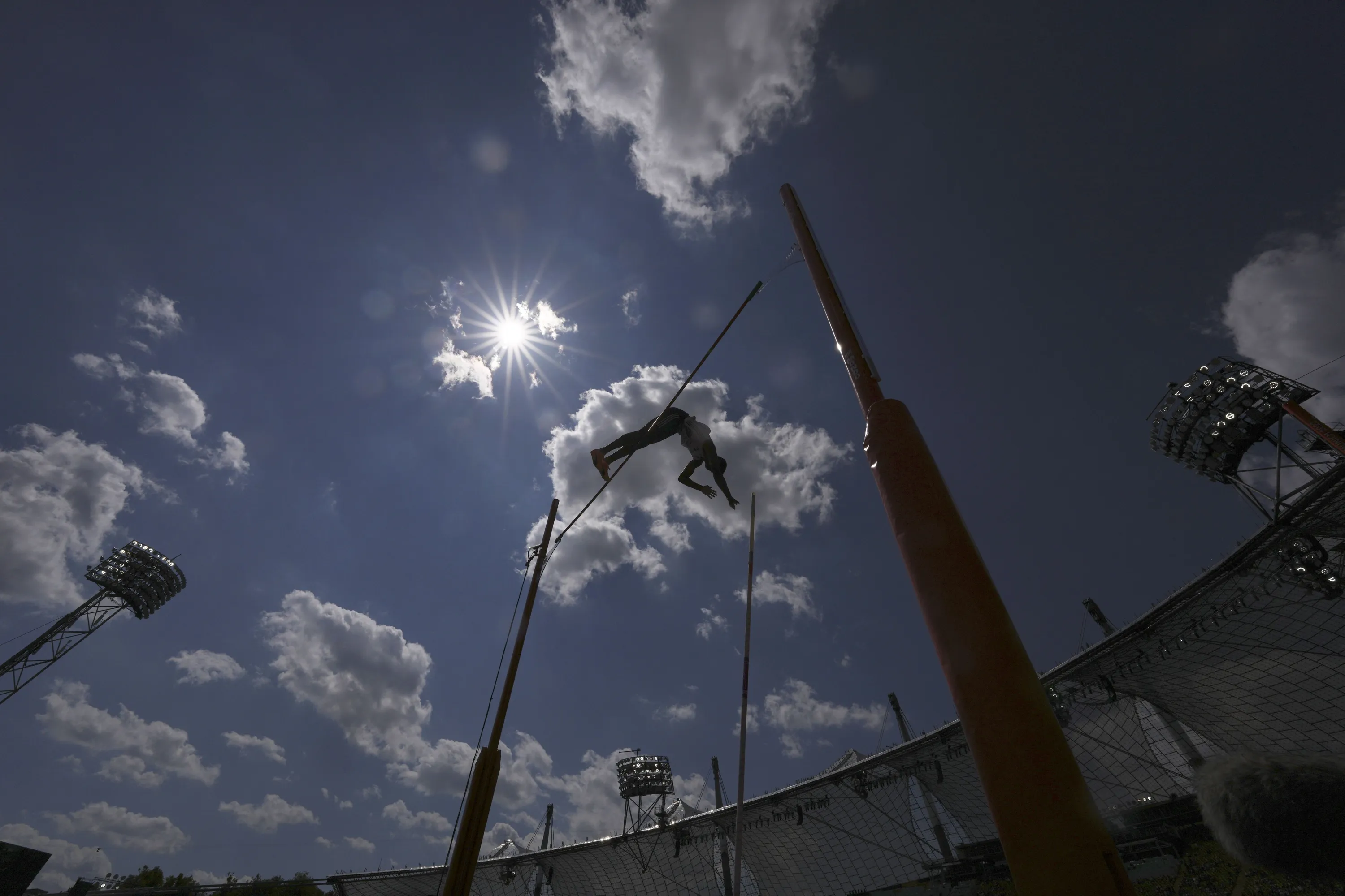 Baptiste Thiery, of France, makes an attempt in the Men's decathlon pole vault during the athletics competition in the Olympic Stadium at the European Championships in Munich, Germany, Tuesday, August 16, 2022. (Photo by Matthias Schrader/AP Photo)