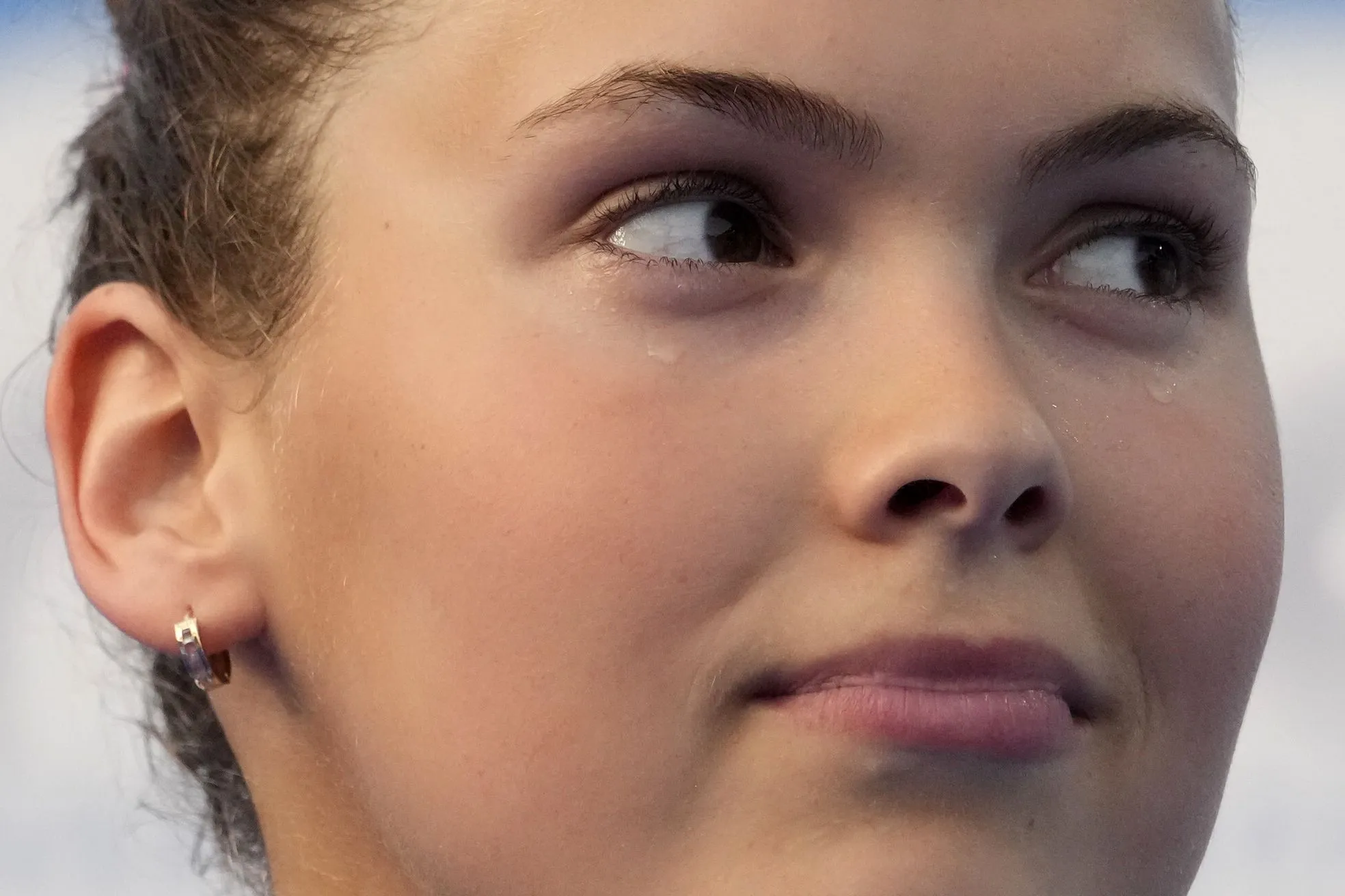Gold medalist Lana Pudar of Bosnia and Herzegovina cries during the national anthem on the podium of the 200m butterfly final at the European swimming championships, in Rome, Wednesday, August 17, 2022. (Photo by Gregorio Borgia/AP Photo)