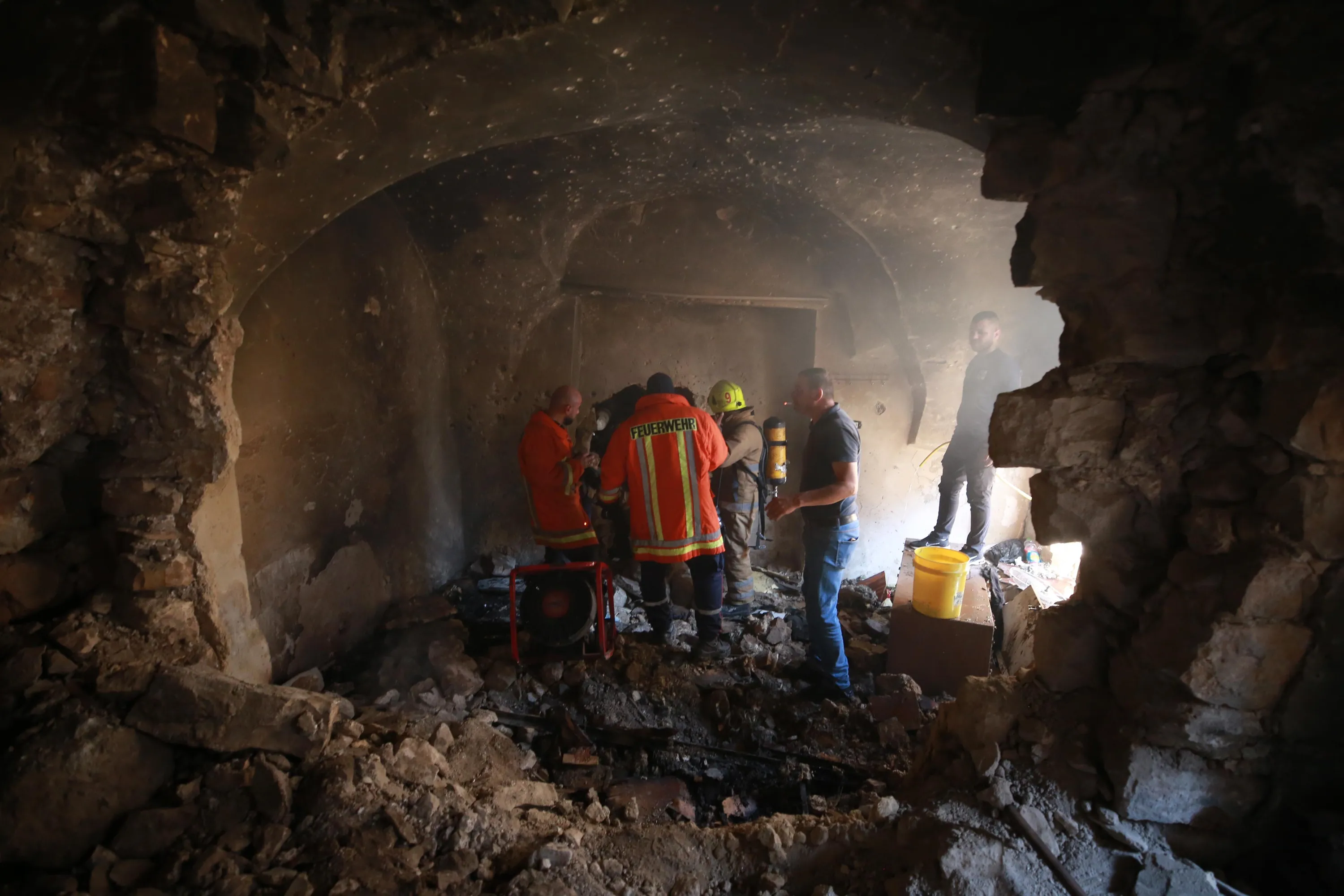 Palestinian firefighters make an investigation at area where 3 Palestinians died during the raid of the old city area in Nablus, West Bank on August 09, 2022. (Photo by Issam Rimawi/Anadolu Agency via Getty Images)