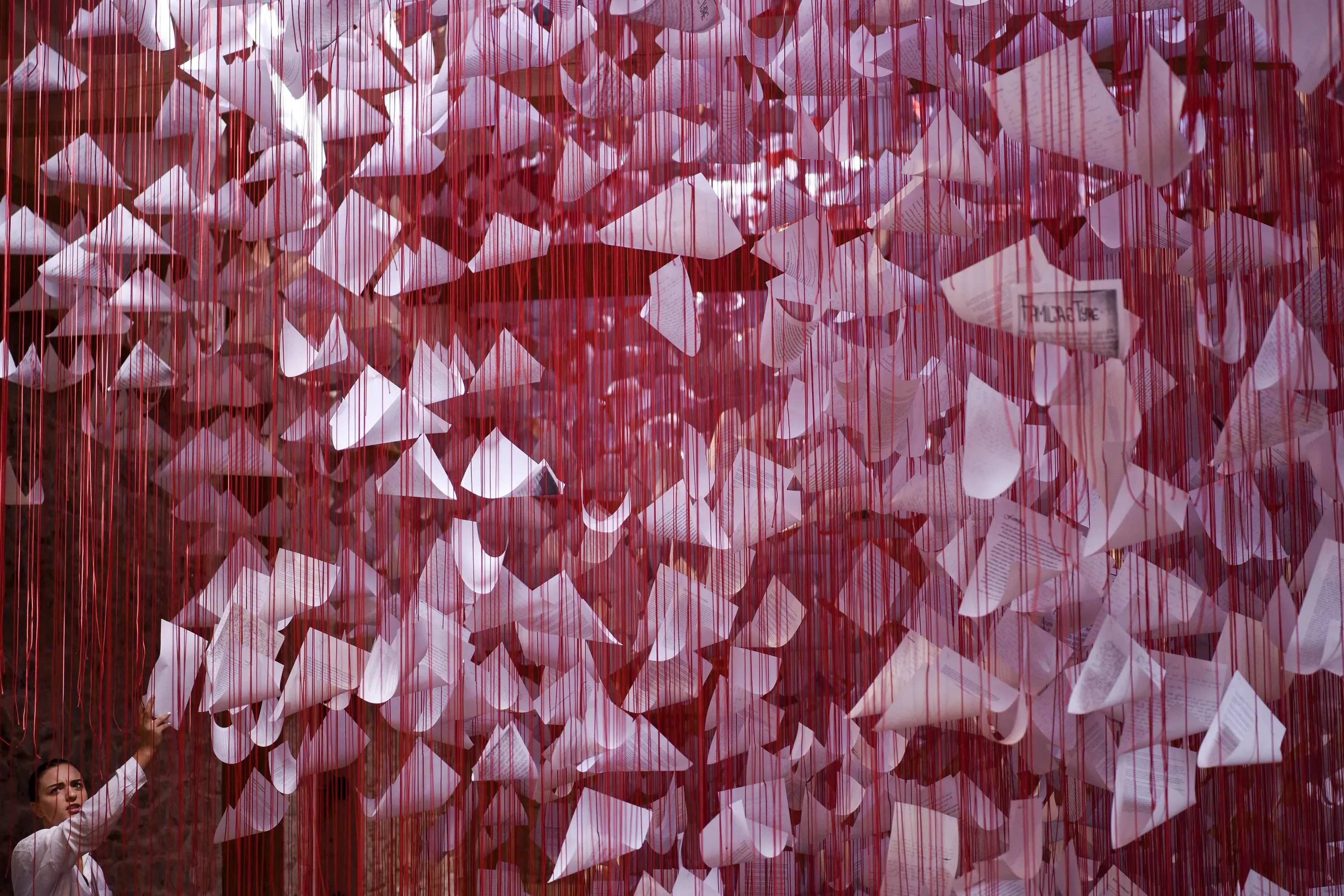 A visitor looks at an installation art called “Tell me your Story” by Japanese artist Chiharu Shiota in Pristina on August 16, 2022, at the 14th edition of the European Nomadic biennale held in Kosovo. (Photo by Armend Nimani/AFP Photo)