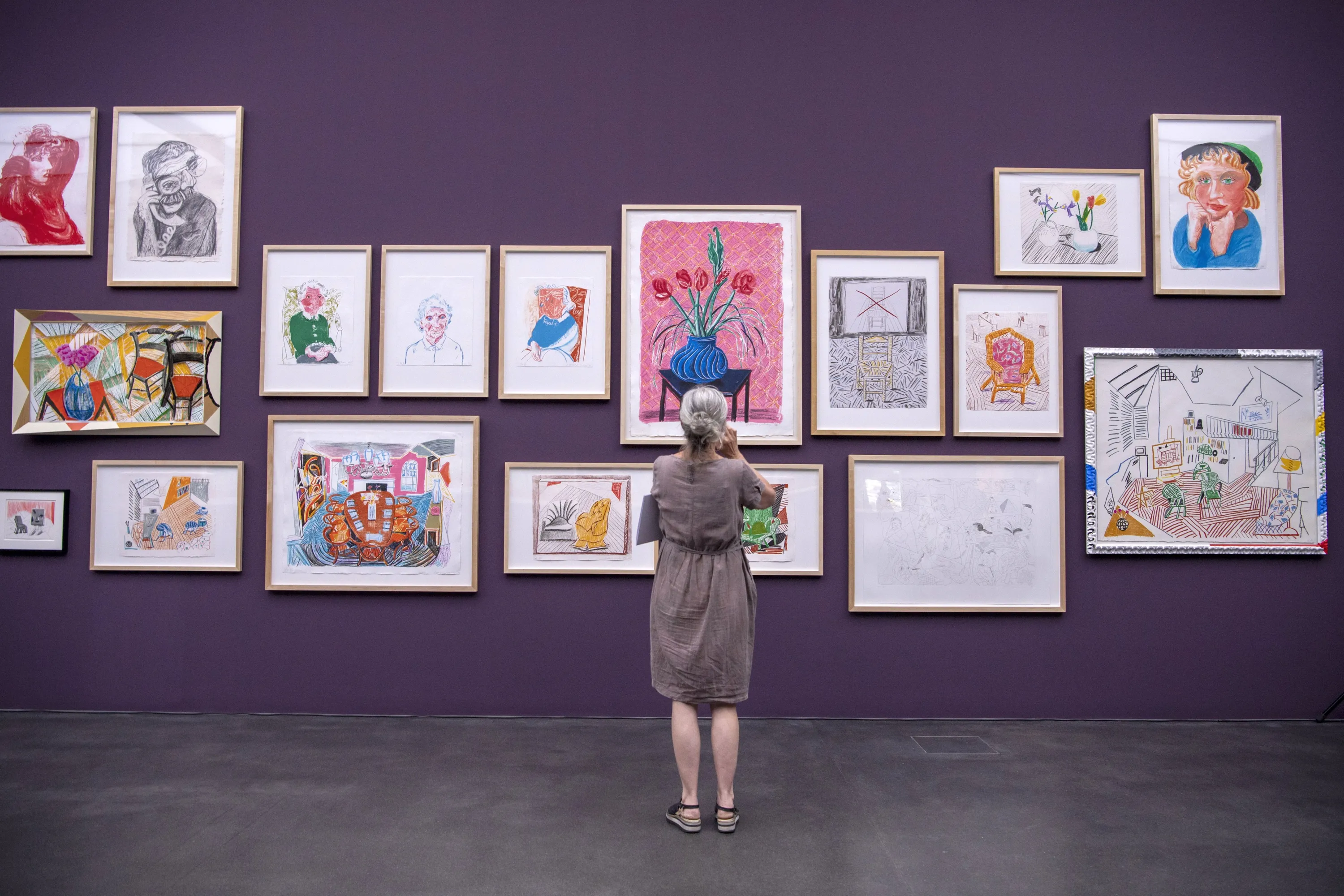 A visitor looks at the paintings “Moving Focus” by British artist David Hockney during the press preview of the exhibition “Moving Focus” at the Kunstmuseum Luzern (art museum Lucerne), in Lucerne, Switzerland, 08 July 2022. The retrospective is the first comprehensive exhibition of Hockey's works in Switzerland, presenting works from 1954 to 2018. The exhibition iruns from 09 July until 30 October 2022. (Photo by Urs Flueeler/EPA/EFE)