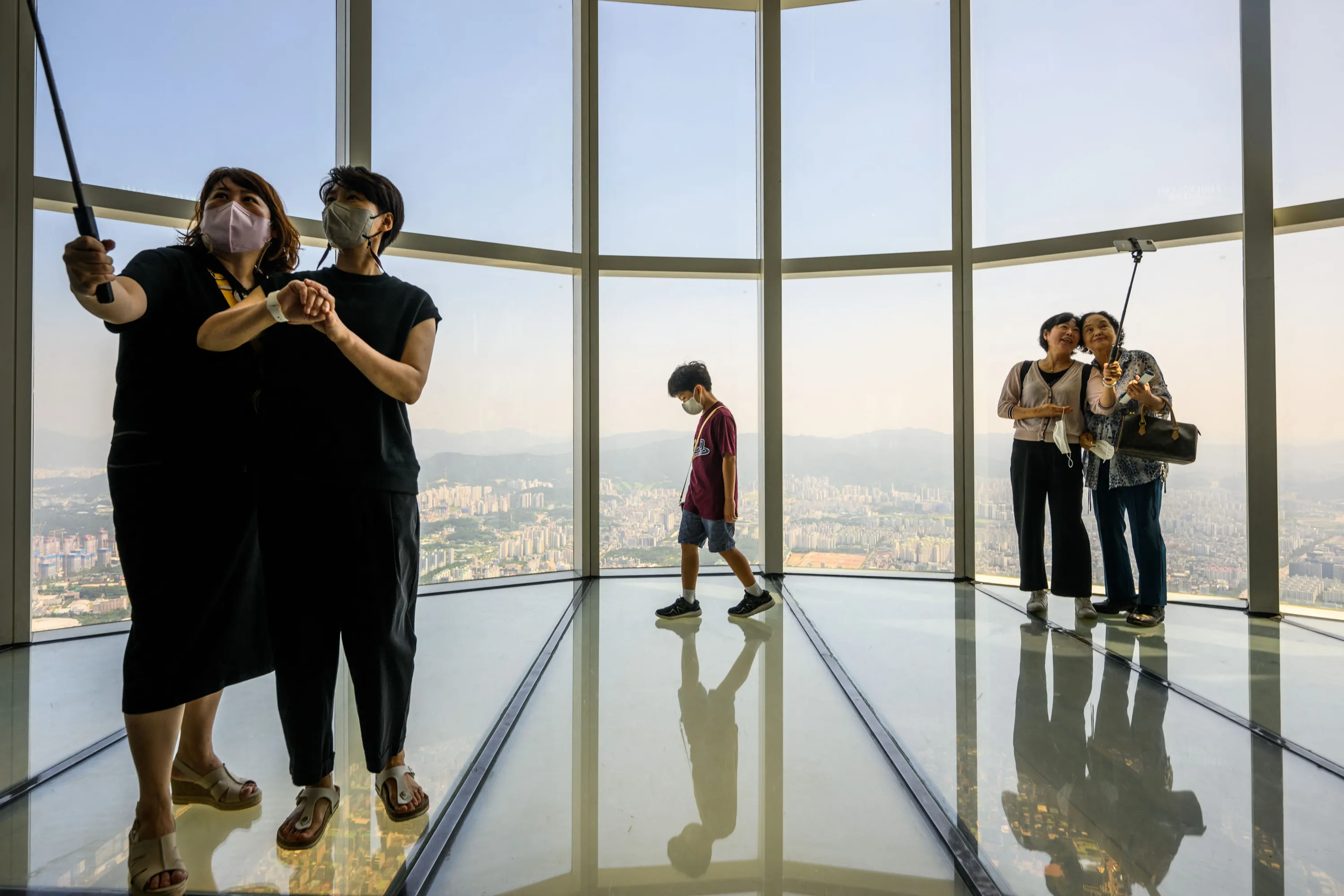 Visitors pose for selfies as a young boy walks on the observation deck at the Lotte World Tower Seoul Sky in Seoul on August 12, 2022. (Photo by Anthony Wallace/AFP Photo)