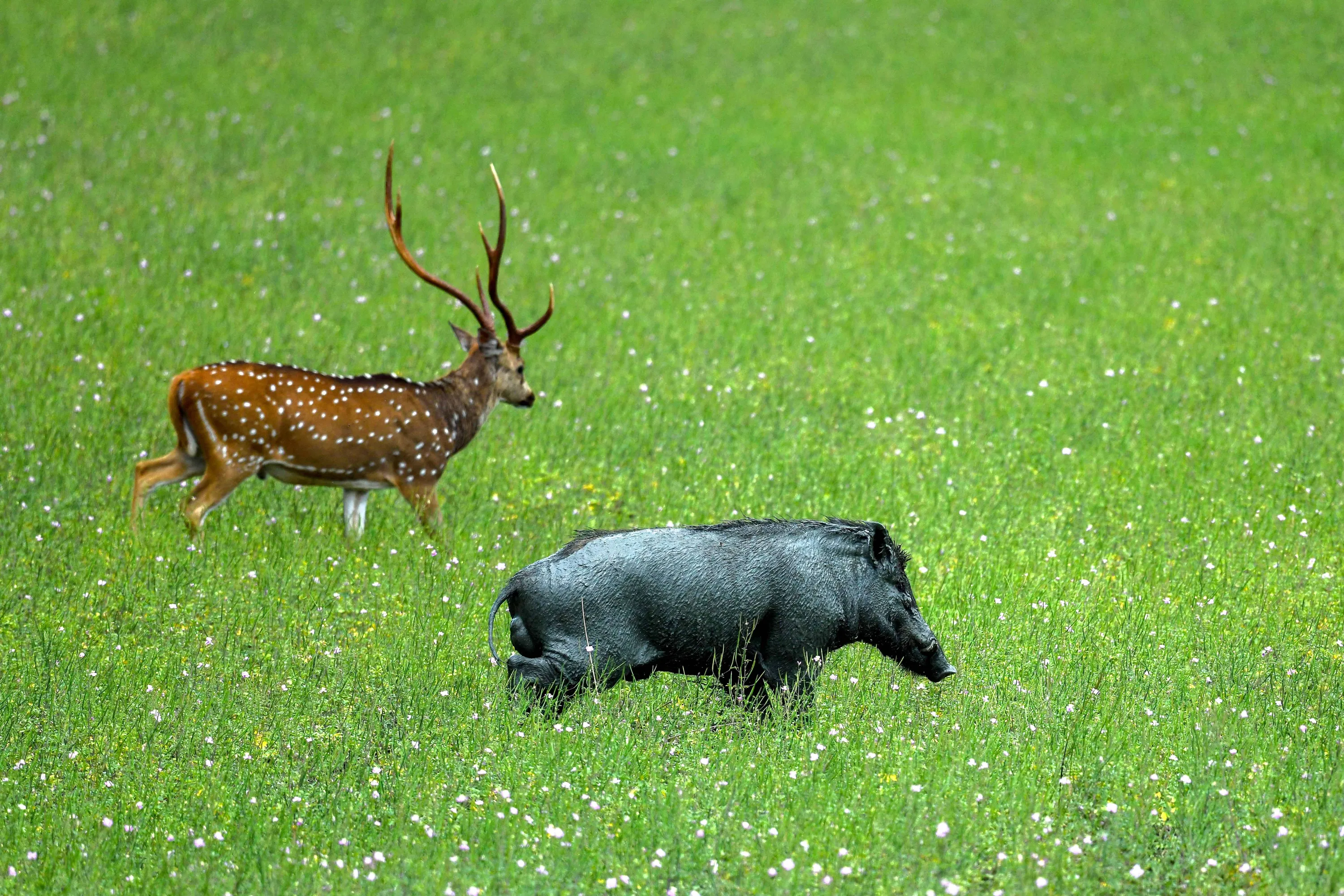 A wild boar (R) and Ceylon spotted deer roam in a meadow of the Yala National Park in Yala, Sri Lanka on August 22, 2022. (Photo by Ishara S. Kodikara/AFP Photo)