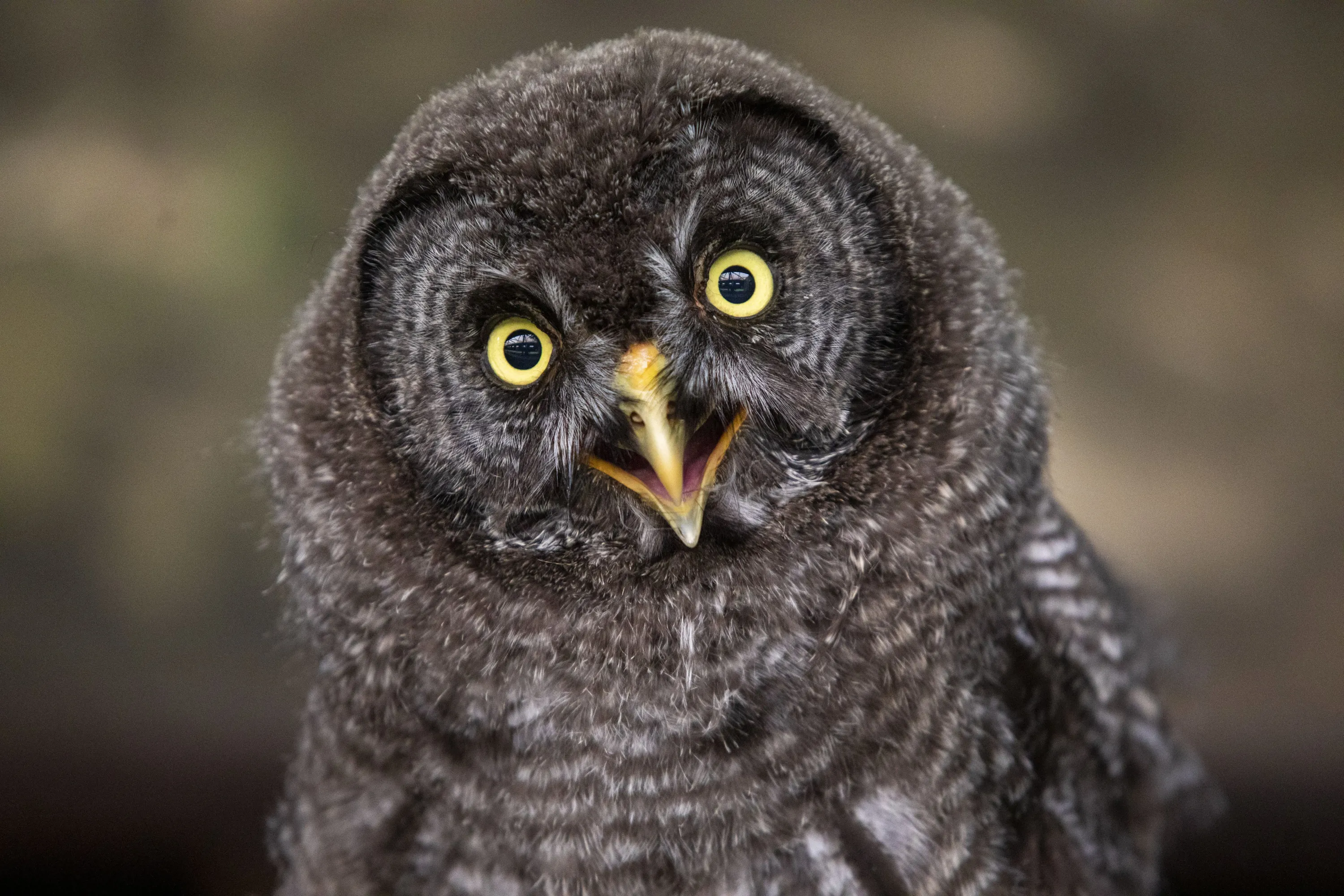 Eight-week-old great grey owl chick starts their flying school training at Scottish Owl Centre in West Lothian on August 8, 2022. Keepers are teaching the young bird how to fly to food like her parents would in the wild – and use bits of chicken to lure her. They said the curious youngster sometimes struggles to pay attention in class and would rather use her newfound freedom to explore. (Photo by Katielee Arrowsmith/South West News Service)