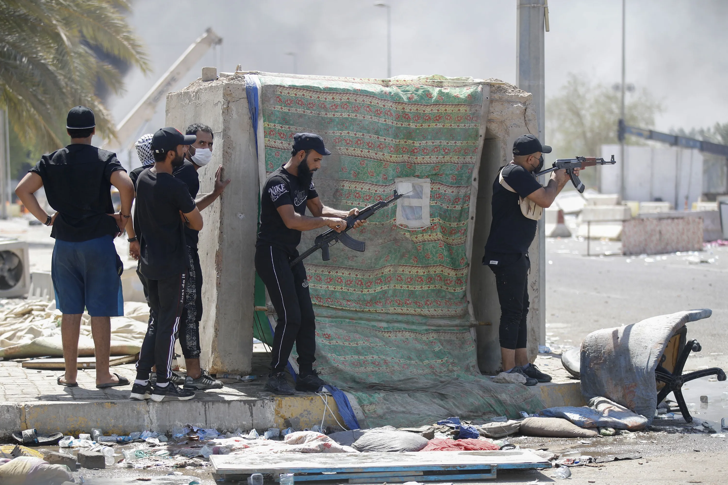 Armed members of Saraya al-Salam (Peace Brigade), the military wing affiliated with Shiite cleric Moqtada al-Sadr, are pictured during clashes with Iraqi security forces in Baghdad's Green Zone on August 30, 2022. Fighting between rival Iraqi forces resumed in Baghdad, where 23 supporters of Shiite leader Moqtada Sadr have been shot dead since Monday, according to the latest toll by medics. Clashes between Sadr's supporters and the army and men of the Hashed al-Shaabi, former paramilitaries integrated into the Iraqi forces, had calmed down overnight but resumed again on this morning. (Photo by Ahmad Al-rubaye/AFP Photo)