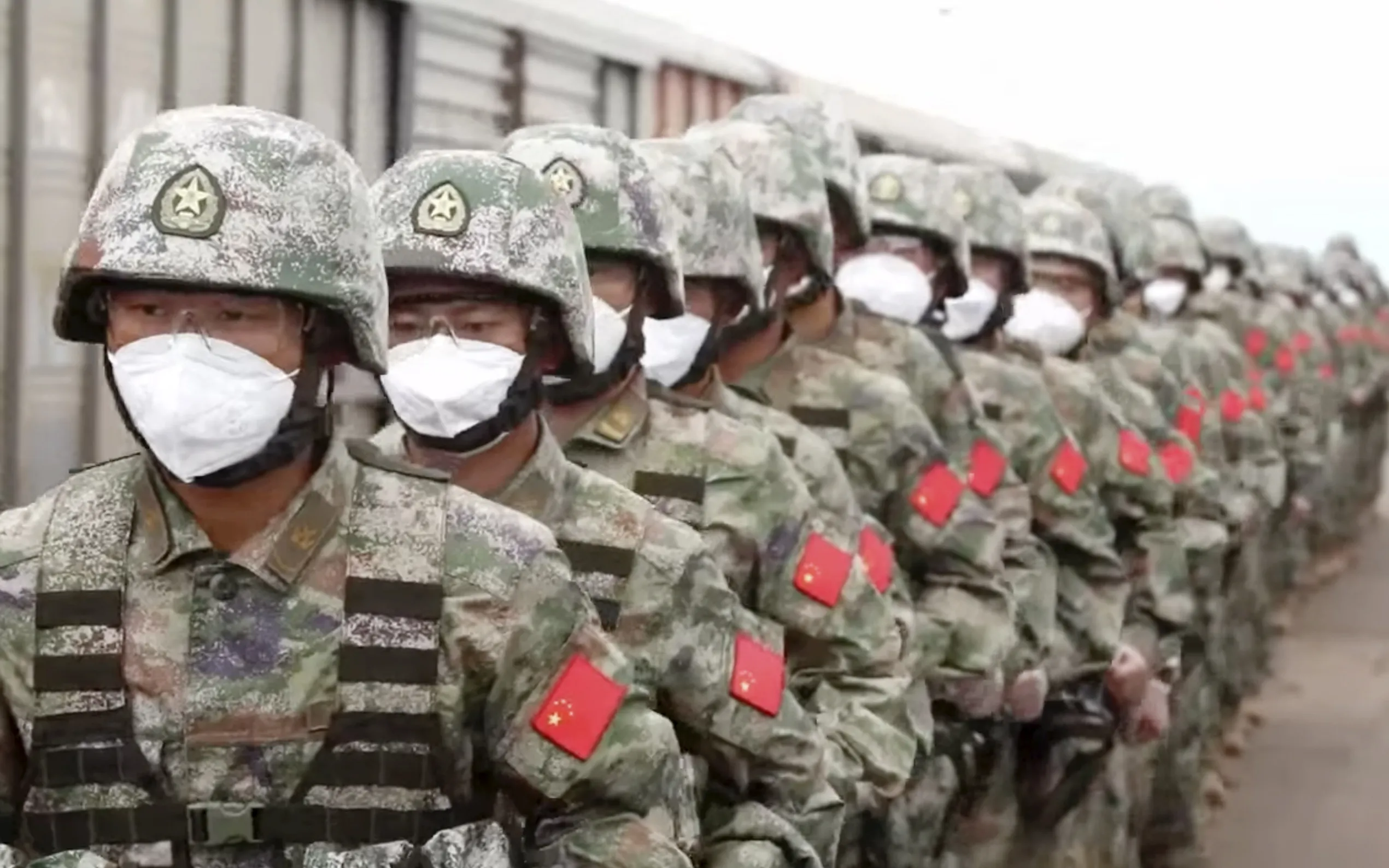 In this handout photo taken from video released by Russian Defense Ministry Press Service on Monday, August 29, 2022, Chinese soldiers arrive to the Grodekovo railway station to participate in war games drills, in Grodekovo, Primorsky Krai, Russia. Russia said Monday it will launch sweeping war games drills in the country's east that will involve forces from China – a show of increasingly close military ties between Moscow and Beijing amid tensions with the West over the Kremlin's action in Ukraine. (Photo by Russian Defense Ministry Press Service via AP Photo)