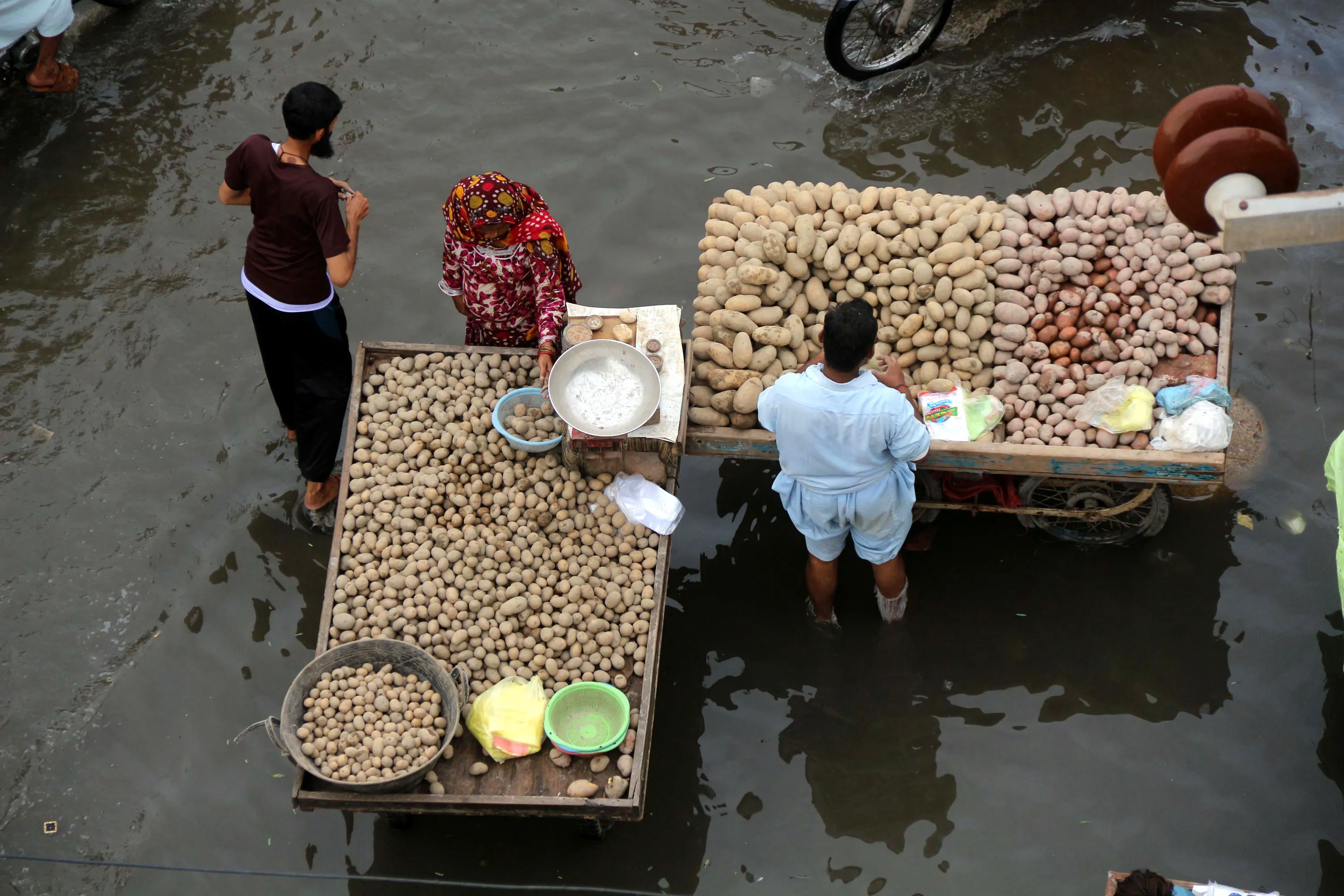 Vendors sell grocery in flooded areas in Hyderabad, Pakistan, 25 August 2022. (Photo by Nadeem Khawar/EPA/EFE)