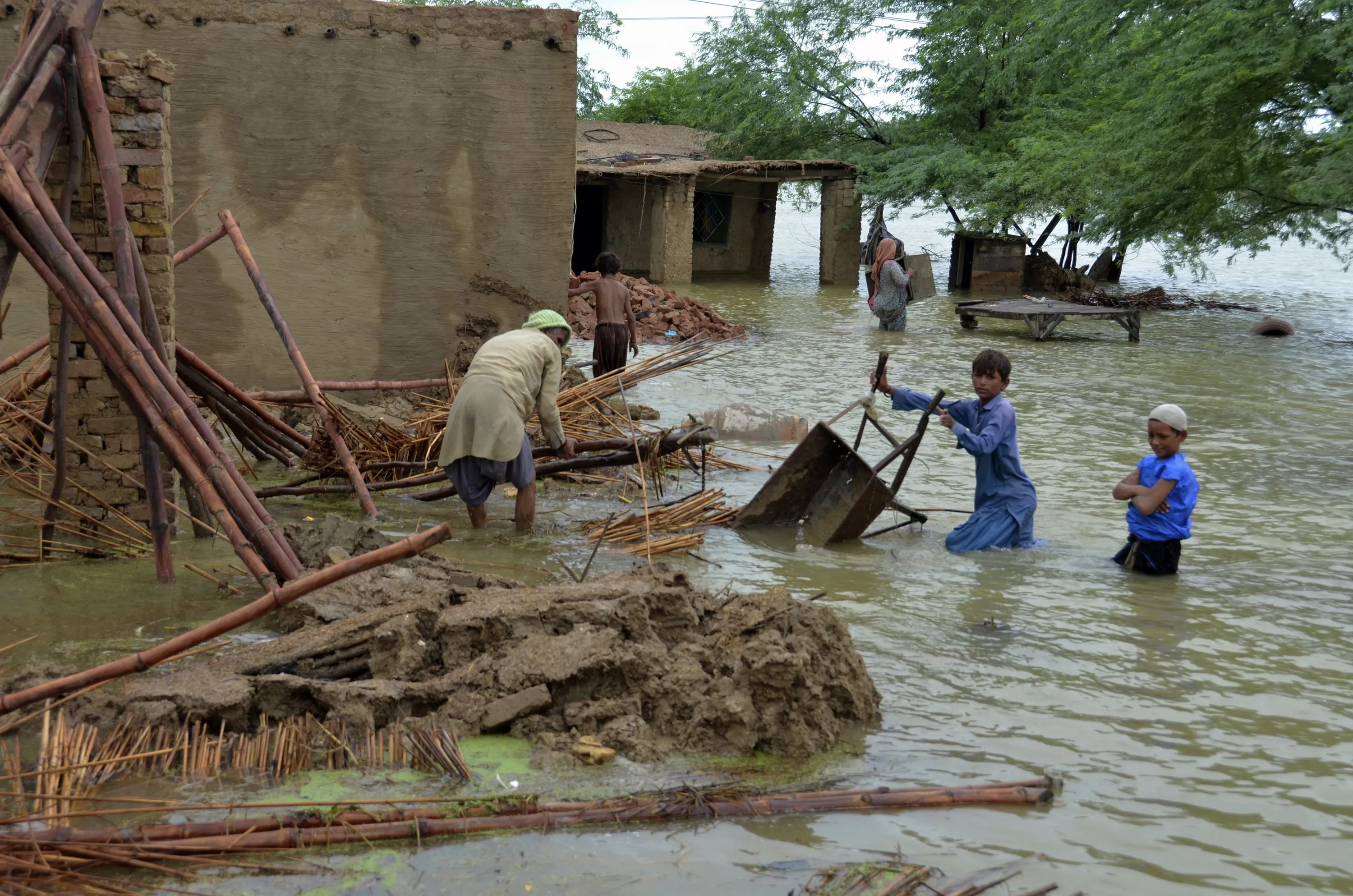 A family salvage usable items from their flood-hit home in Jaffarabad, a district of Pakistan's southwestern Baluchistan province, Thursday, August 25, 2022. (Photo by Zahid Hussain/AP Photo)