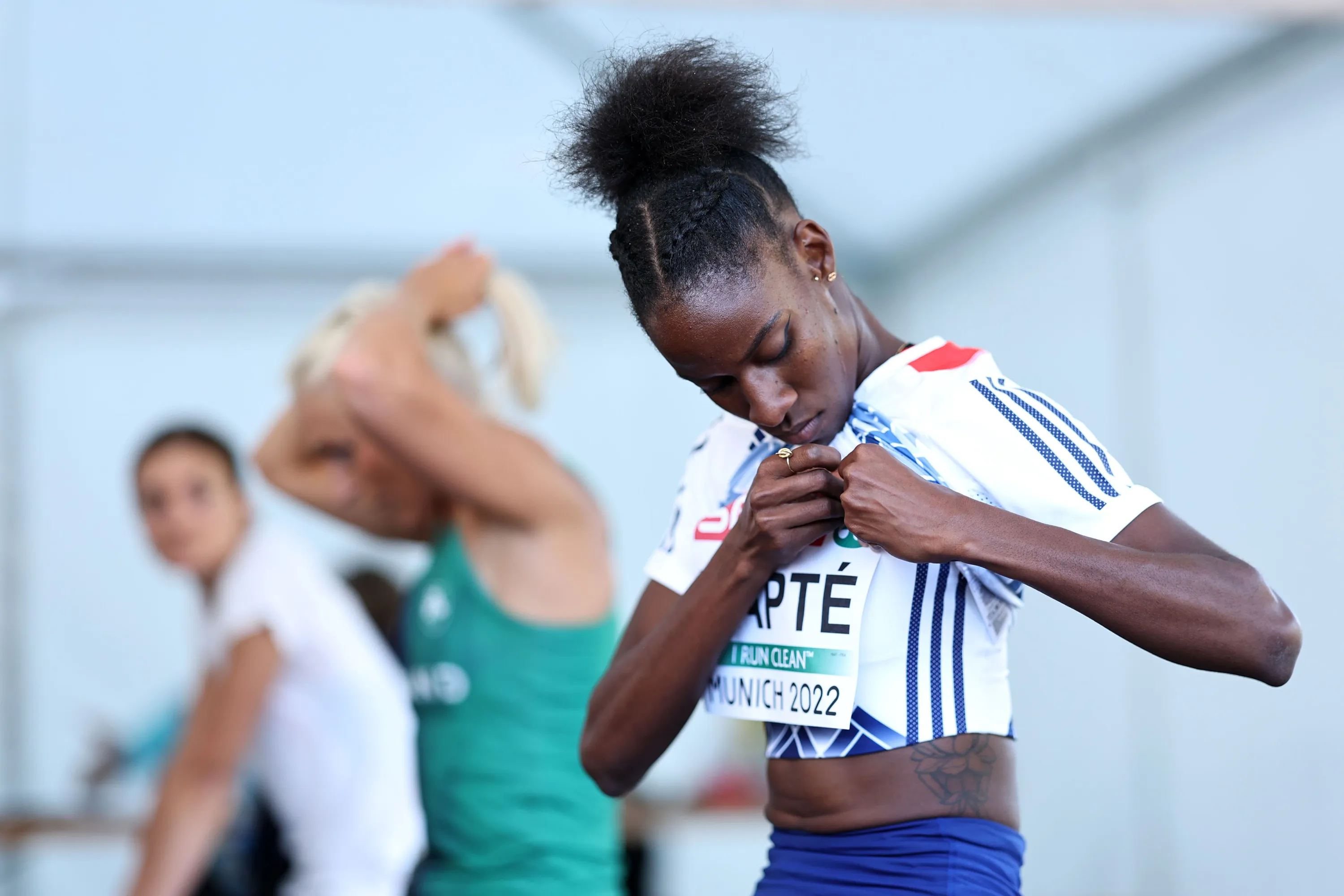 Laeticia Bapte of France reacts prior to the Athletics – Women's 100m Hurdles Semi Final 2 on day 11 of the European Championships Munich 2022 at Olympiapark on August 21, 2022 in Munich, Germany. (Photo by Simon Hofmann/Getty Images for European Athletics)