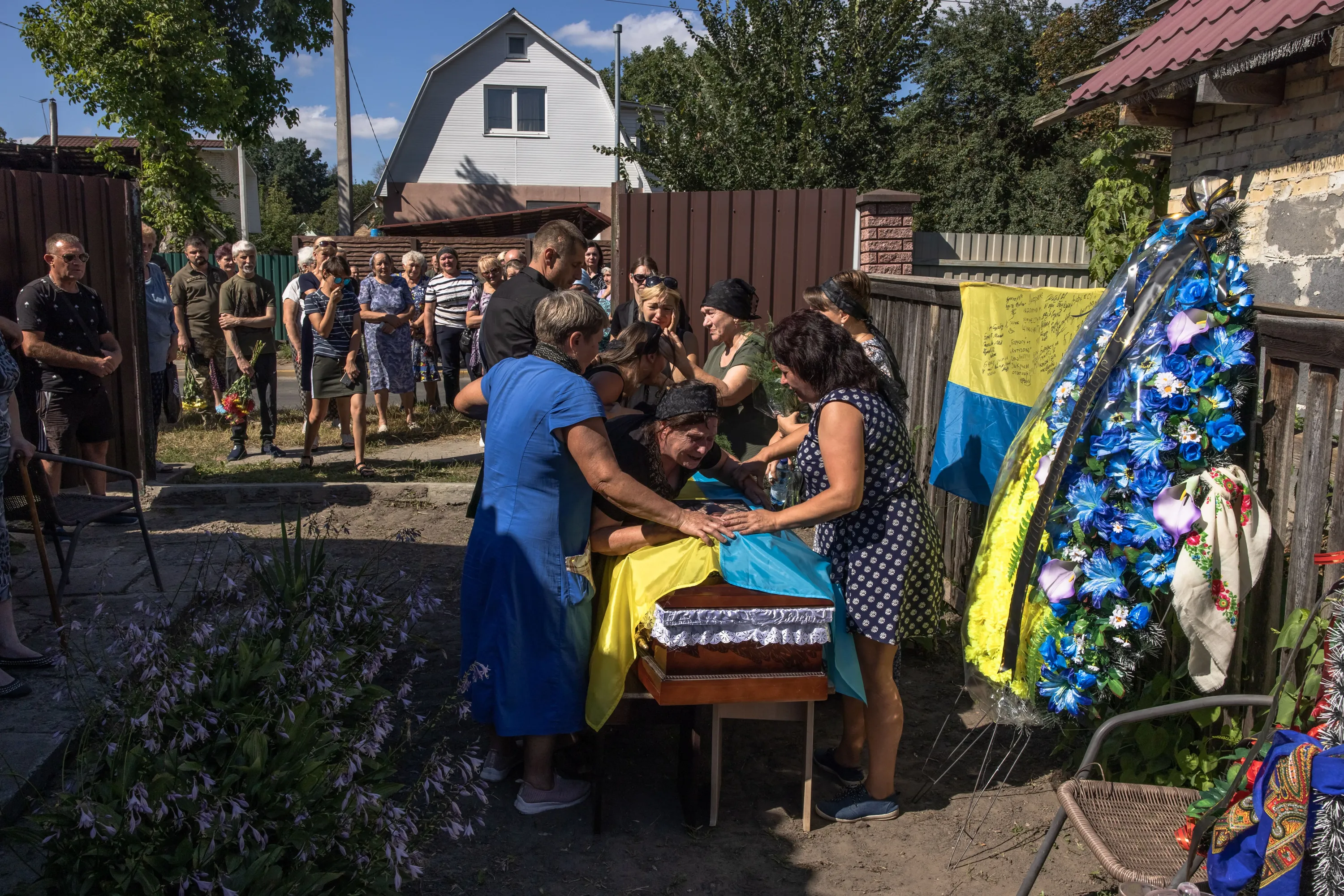 Kateryna (C), the mother of the fallen Ukrainian soldier Andrii Dzyubenko, along with other relatives, friends and comrades, mourns next to the coffin during his funeral ceremony in Bucha, northwest of Kyiv (Kiev), Ukraine, 30 August 2022. Ukrainian soldier Andrii Dzyubenko was killed in a battle near Maryinka, Donetsk region, on 24 August. Russian troops on 24 February entered Ukrainian territory, starting a conflict that has provoked destruction and a humanitarian crisis. (Photo by Roman Pilipey/EPA/EFE)