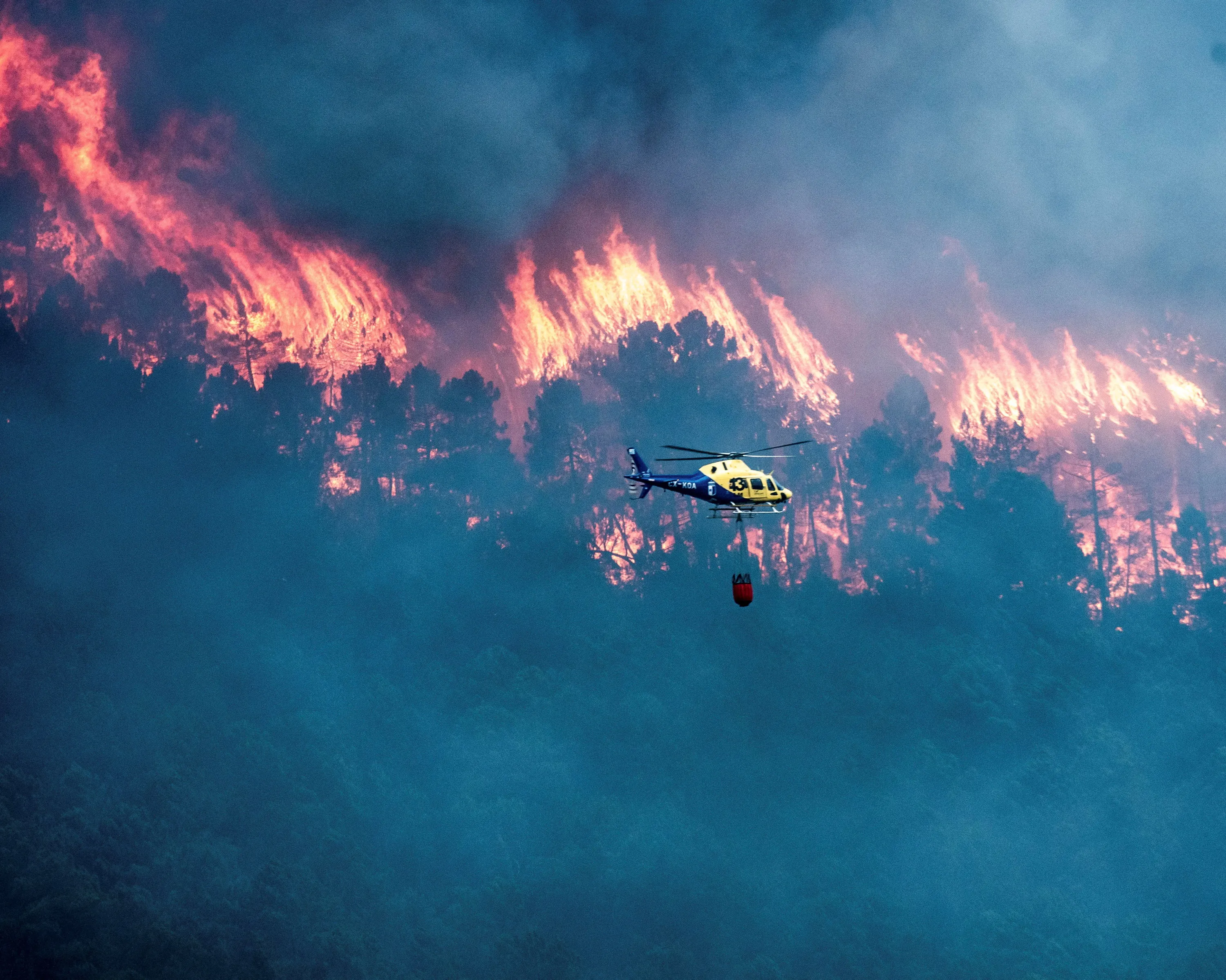 A helicopter helps to extinguish a wildfire burning in Albacete, Castilla-La Mancha, Spain August 30, 2022 in this picture obtained from social media. (Photo by Javier Valdelvira/via Reuters)