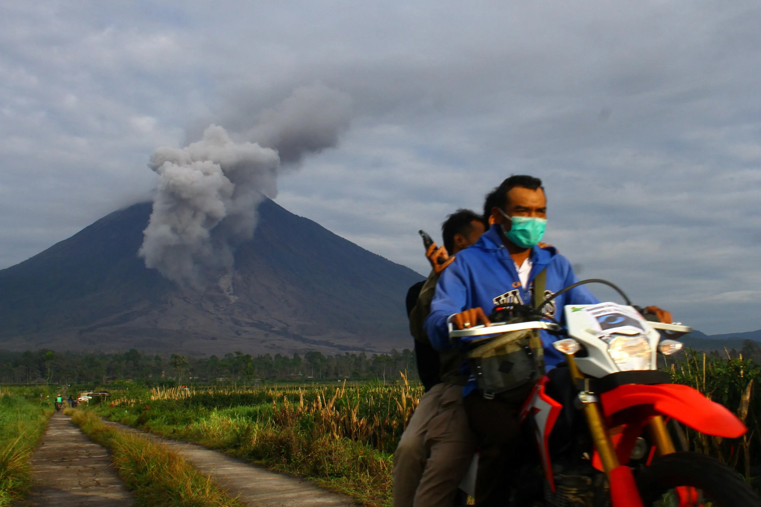 Villagers ride a motorcycle as Mount Semeru volcano spews ash and smoke in Supiturang village, Lumajang, East Java province, Indonesia, December 7, 2021. (Photo by Ari Bowo Sucipto/Antara Foto via Reuters)
