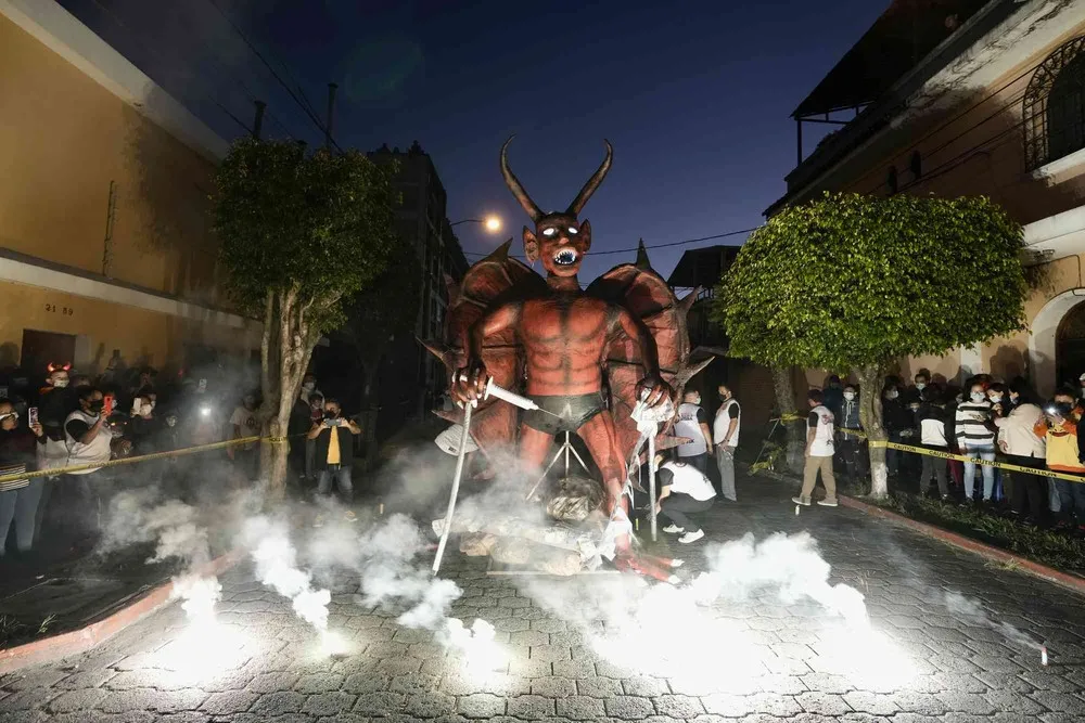 An effigy representing the Devil is set to burn during the Virgin of the Immaculate Conception celebrations in Guatemala City, Tuesday, December 7, 2021. (Photo by Moises Castillo/AP Photo)