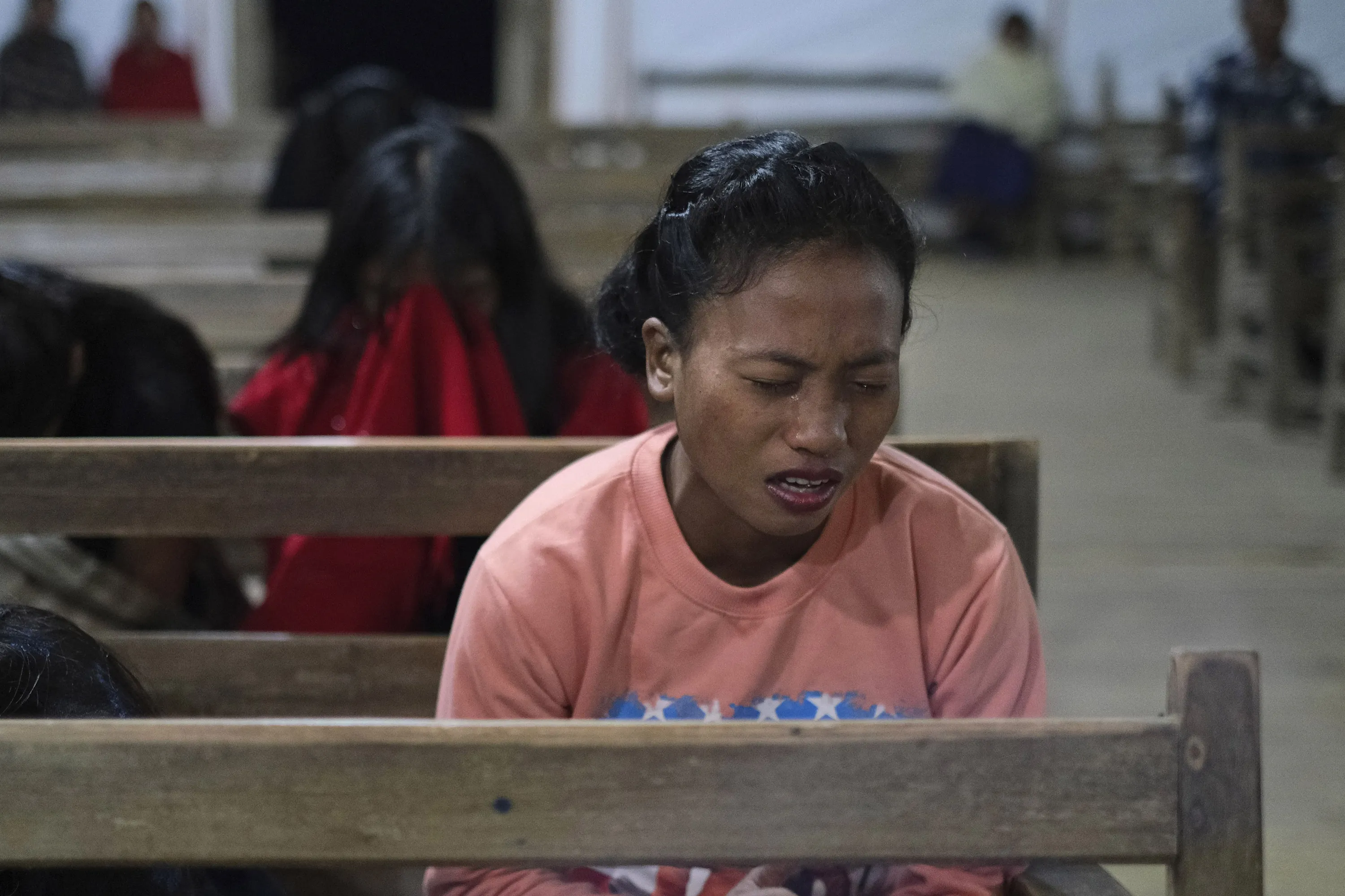 Tears flow down the cheek of a Konyak Naga girl as she prays inside a church in Oting village, in the northeastern Indian state of Nagaland, Wednesday, December 15, 2021. High up in the hills along India's border with Myanmar, Oting village in the northeastern state of Nagaland is in mourning after more than a dozen people were killed by soldiers. The incident earlier this month is the latest violence to shake the state of Nagaland and has left Oting village reeling in shock and grief for their lost ones. (Photo by Yirmiyan Arthur/AP Photo)
