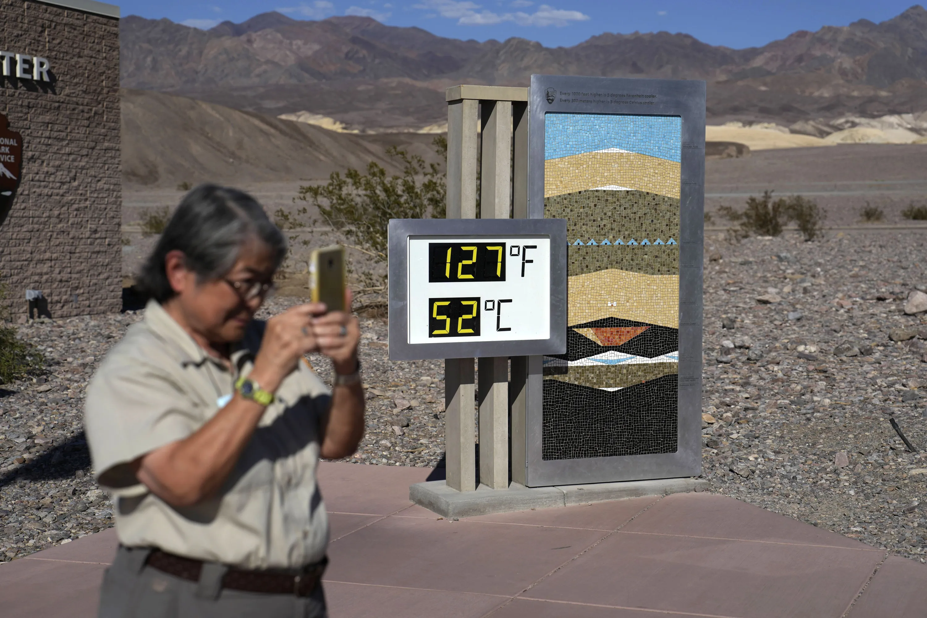 People visit a thermometer at the Furnace Creek Visitor Center, Thursday, September 1, 2022, in Death Valley National Park, Calif. The thermometer is not official but is a popular photo spot. (Photo by John Locher/AP Photo)