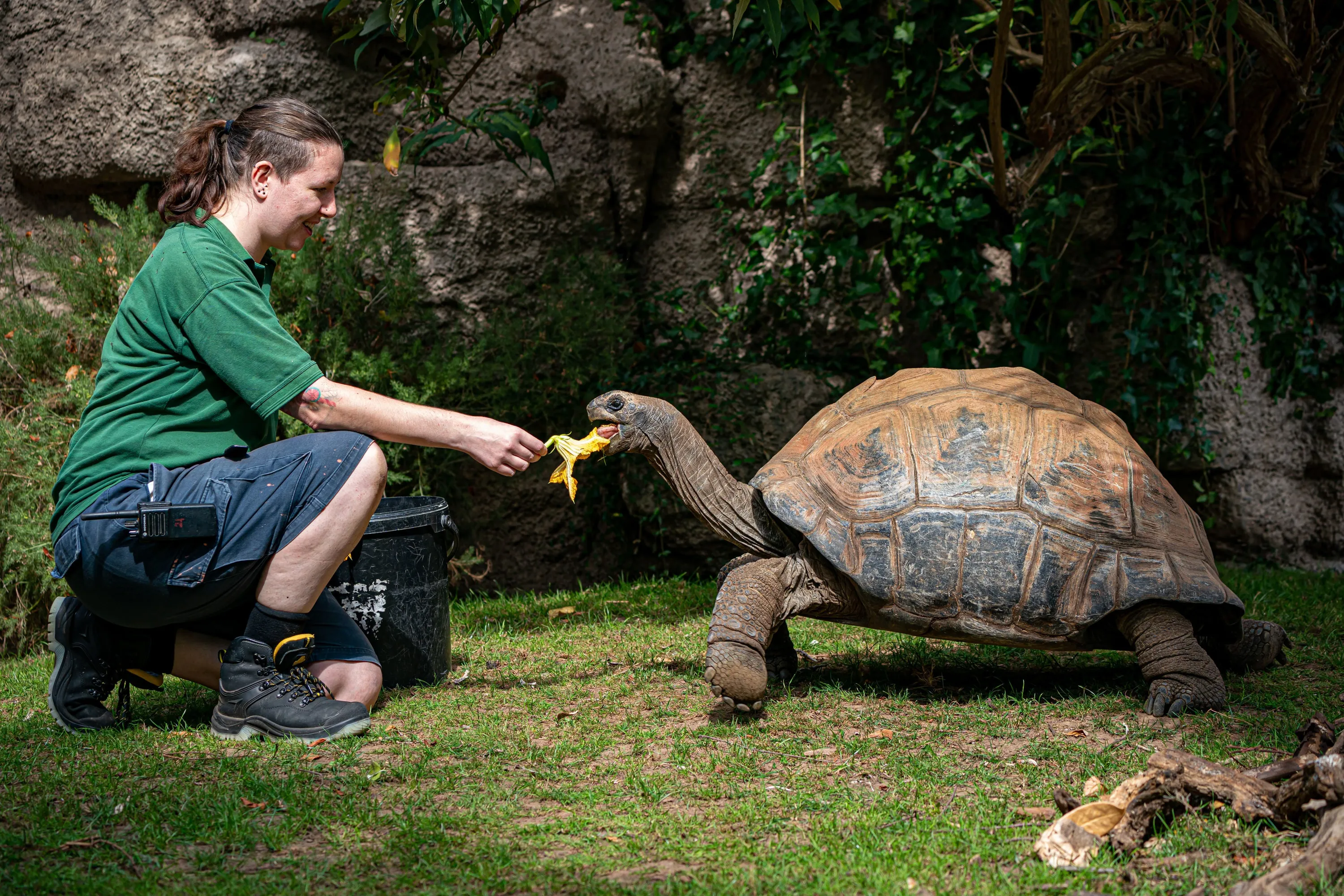 Reptile keeper Laura Cosgrove feeds pumpkin flowers as she conducts a close health check on 40-year-old Helen, the Giant Tortoise, at Bristol Zoo Gardens on Wednesday August 31, 2022, ahead of its closure in Saturday. The attraction is to close after 186 years and is set to move to a site in south Gloucestershire after its site in Clifton was sold to cover funding shortfalls caused by the pandemic and a general fall in visitor numbers. (Photo by Ben Birchall/PA Images via Getty Images)