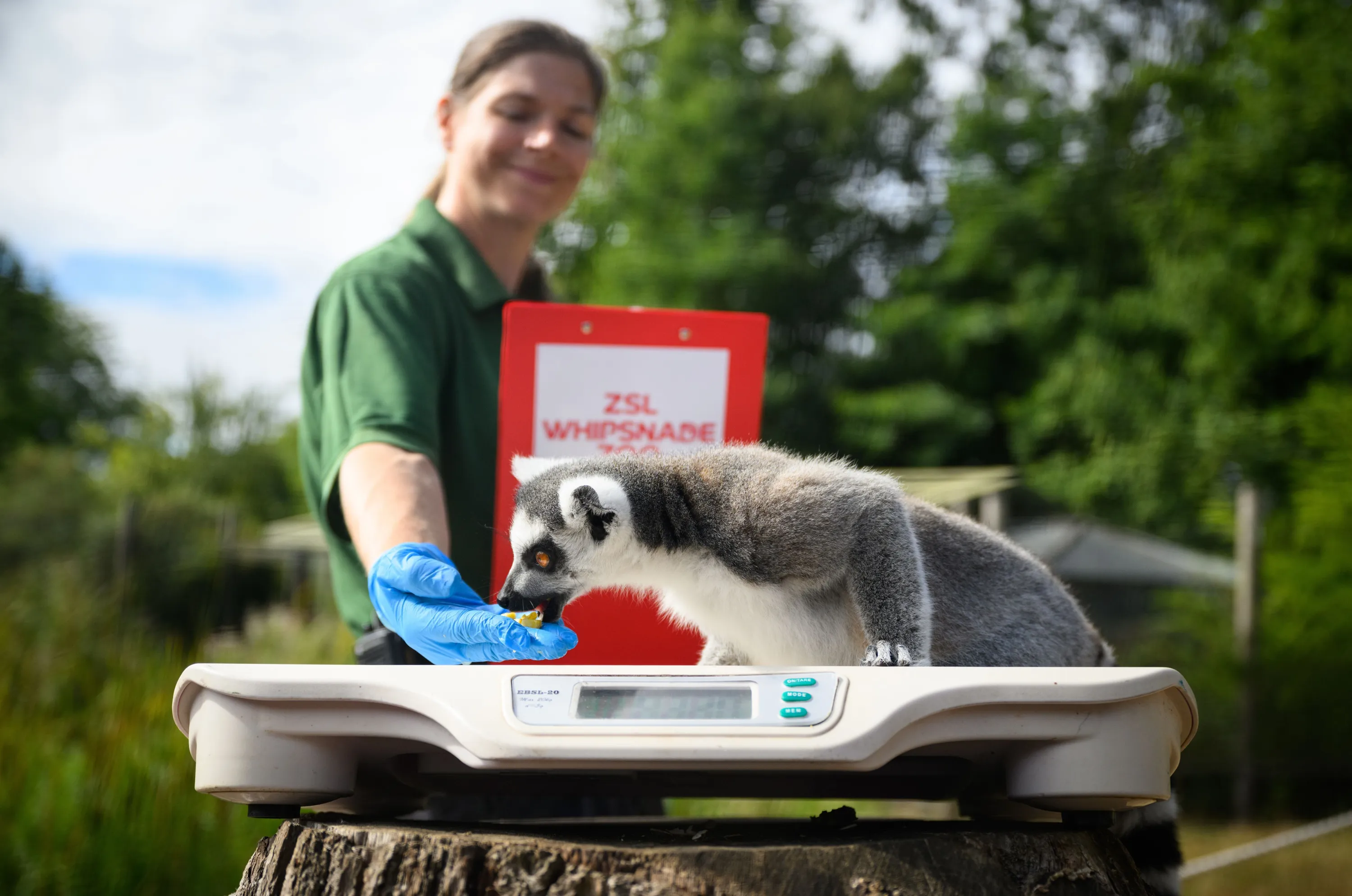 A Ring-tailed limar is weighed by keeper Jane Storr during a photo-call at ZSL Whipsnade Zoo on August 23, 2022 in Dunstable, England. As part of their regular check-ups, 10,000 animals are having their vital statistics recorded as a way of keeping track of their health and well-being at the UK's largest Zoo. (Photo by Leon Neal/Getty Images)