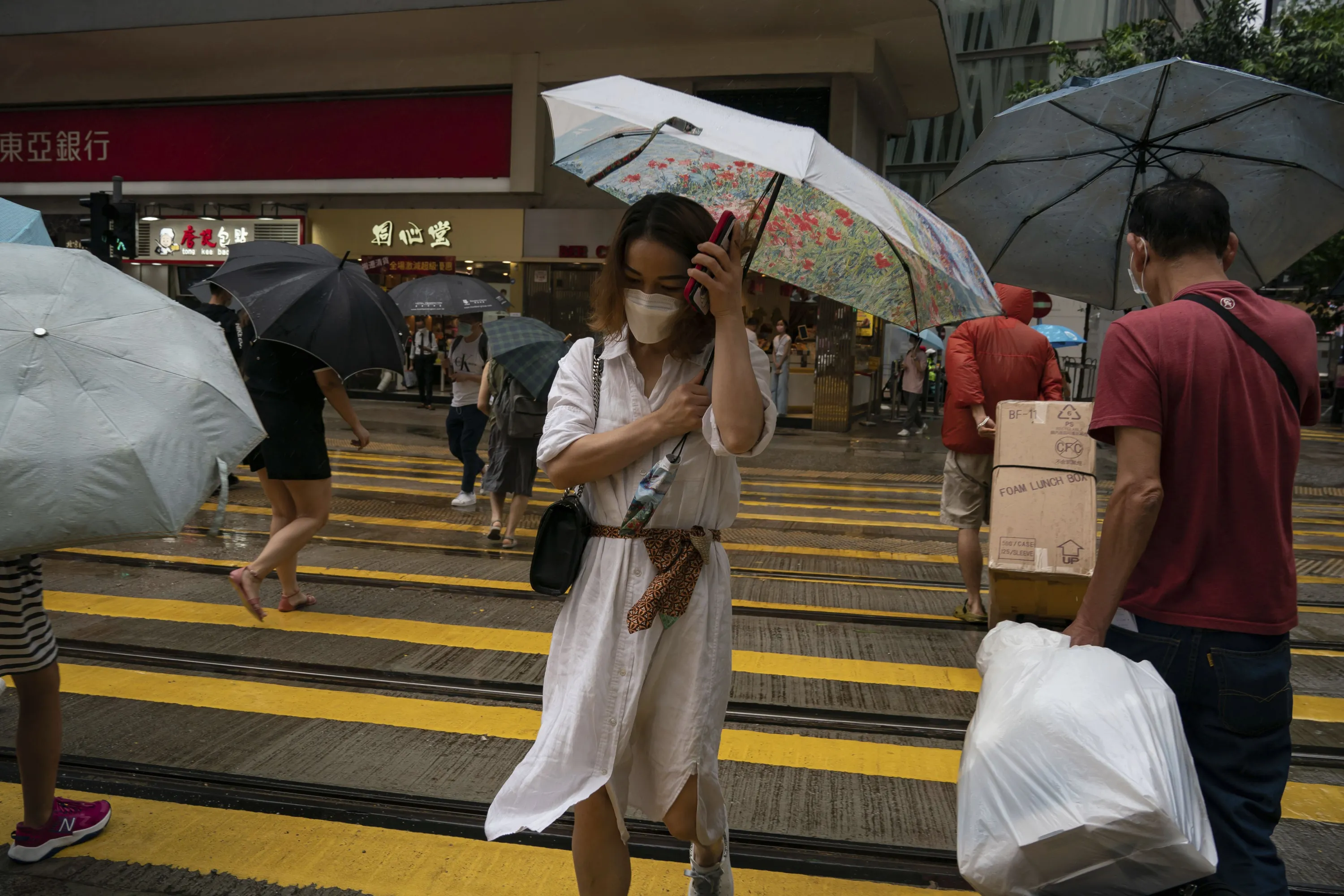 People holding umbrellas under strong wind walk pass a crosswalk as tropical storm Ma-on passes Hong Kong, Thursday, August 25, 2022. Tropical Storm Ma-on made landfall in southern China’s Guangdong province on Thursday after bringing rain and stiff winds to Hong Kong, where the stock market was closed for the morning session due to the storm. (Photo by Anthony Kwan/AP Photo)