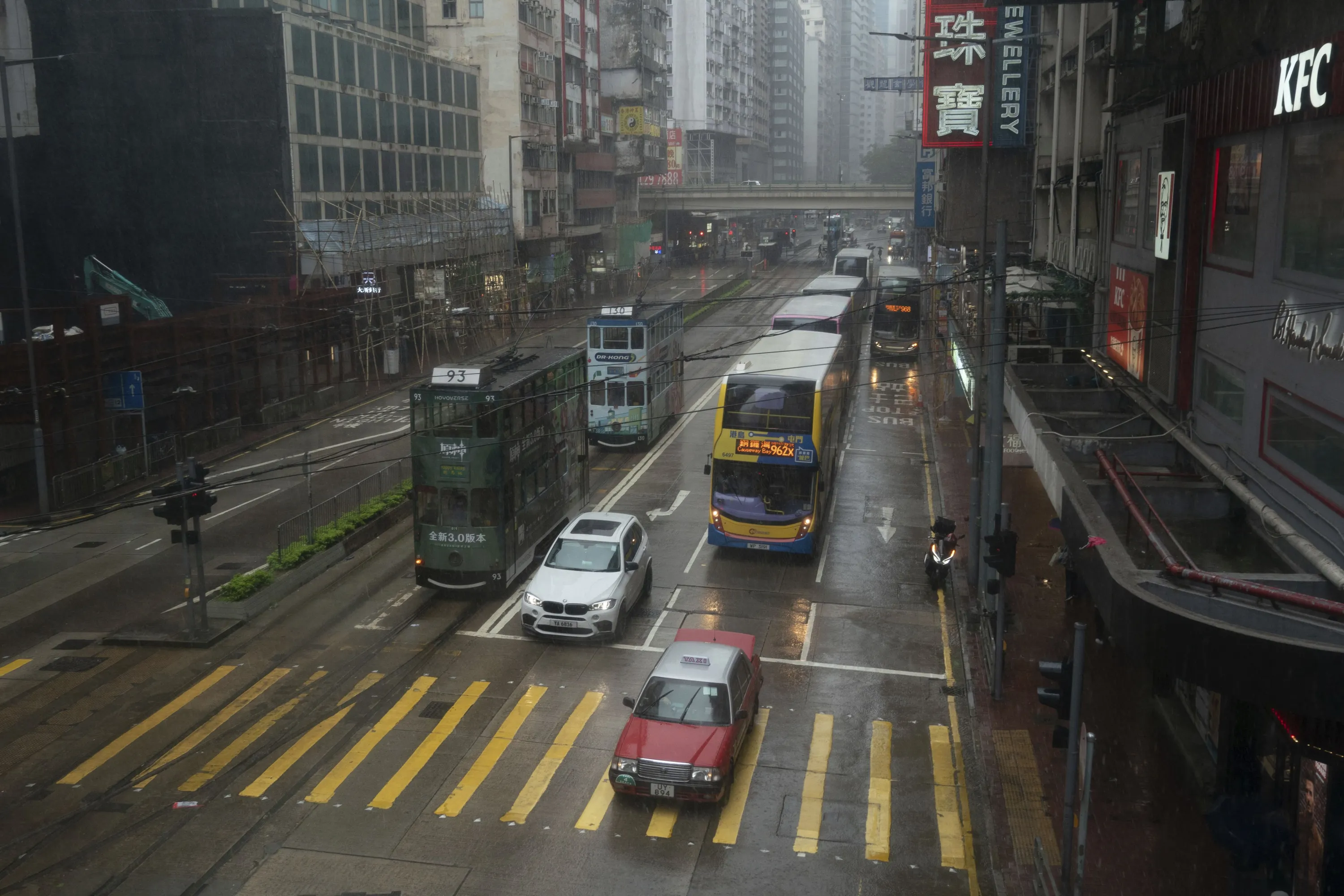 Vehicles drive past an intersection in the Causeway Bay area as tropical storm Ma-on passes Hong Kong, Thursday, August 25, 2022. (Photo by Anthony Kwan/AP Photo)