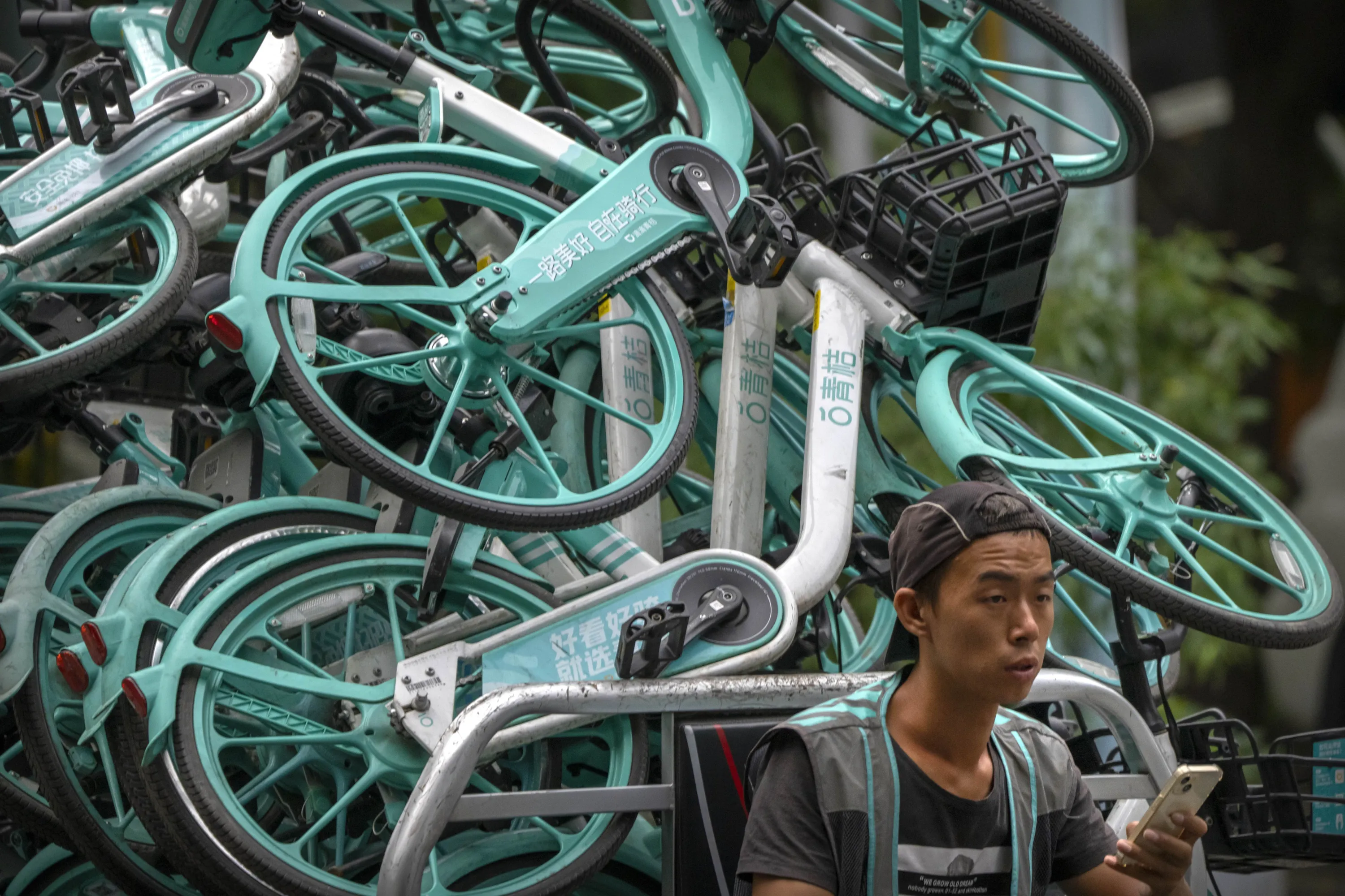 A worker drives a cart loaded with bicycles for a bike sharing app along a street in Beijing, Friday, August 26, 2022. (Photo by Mark Schiefelbein/AP Photo)