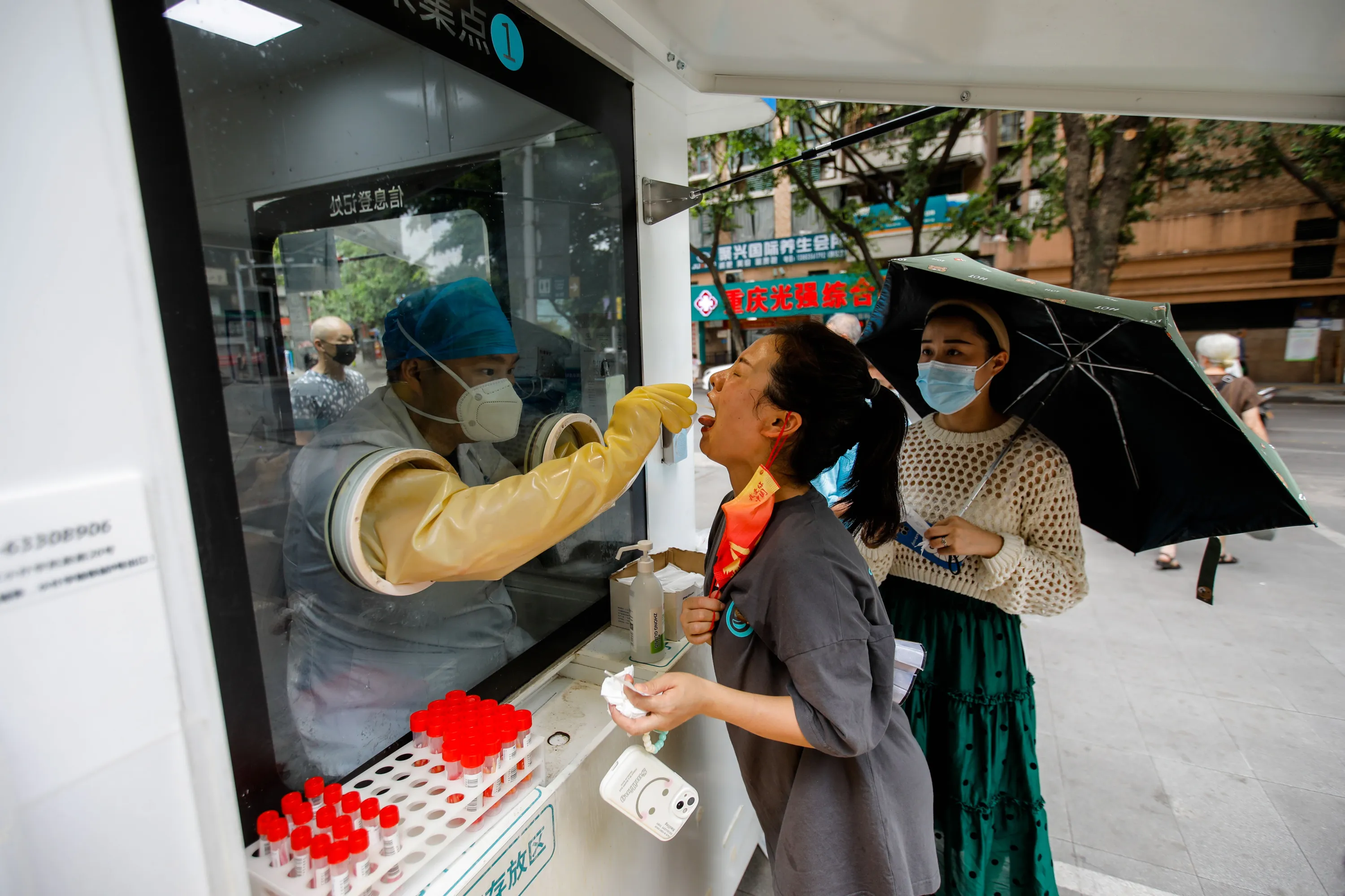 A medical worker takes a swab sample from a woman in Chongqing, China, 29 August 2022. According to the National Health Commission's report on 27 August, 307 new locally transmitted COVID-19 cases were detected in mainland China, of which 12 were in Chongqing. Local Authorities implemented tighter COVID-19 curbs in Chongqing city by imposing mass testing and establishing temporary control areas in the city. (Photo by Wu Hao/EPA/EFE)