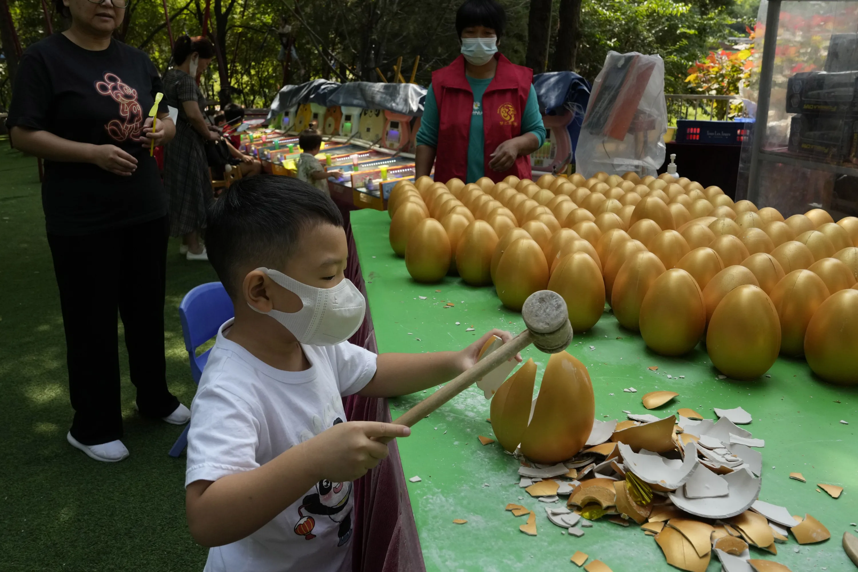 A child wearing a mask smashes a golden egg for a prize in Beijing, Monday, August 29, 2022. A Chinese think tank issued a rare public disagreement Monday with the ruling Communist Party's severe “zero COVID” policy, saying curbs that shut down cities and disrupt trade, travel and industry must change to prevent an “economic stall”. (Photo by Ng Han Guan/AP Photo)