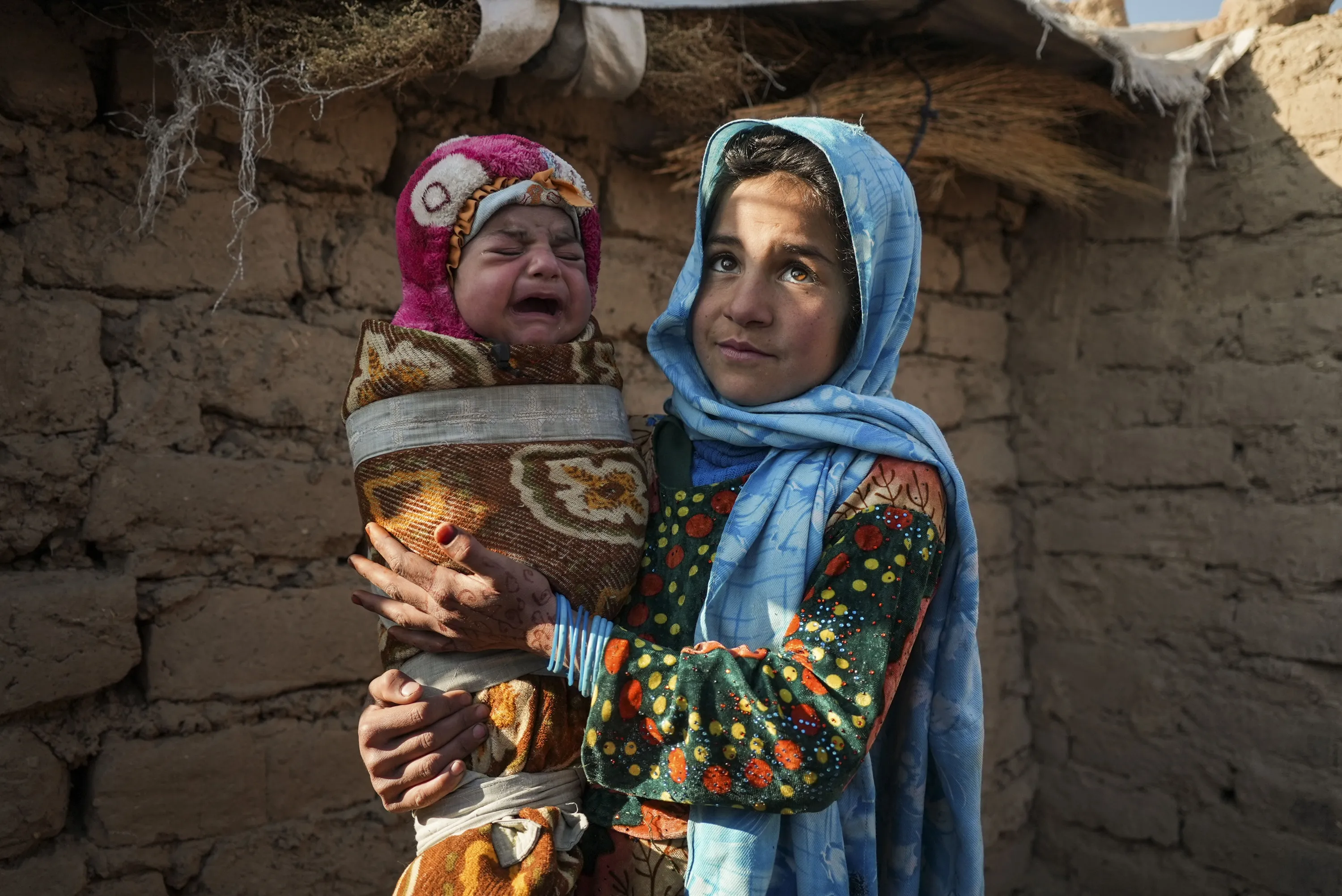 Qandi Gul holds her brother outside their home housing those displaced by war and drought near Herat, Afghanistan. December 16, 2021. Gul’s father sold her into marriage without telling his wife, taking a down-payment so he could feed his family of five children. Without that money, he told her, they would all starve. He had to sacrifice one to save the rest. (Photo by Mstyslav Chernov/AP Photo)